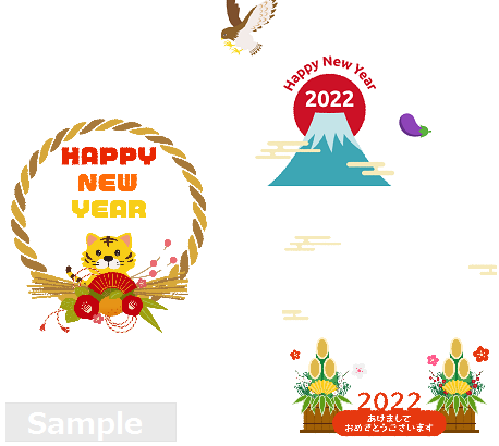 初日の出が昇る富士山、お正月飾りの門松、しめ縄、新年の干支・トラなどをモチーフにしたギフトが5種類。
