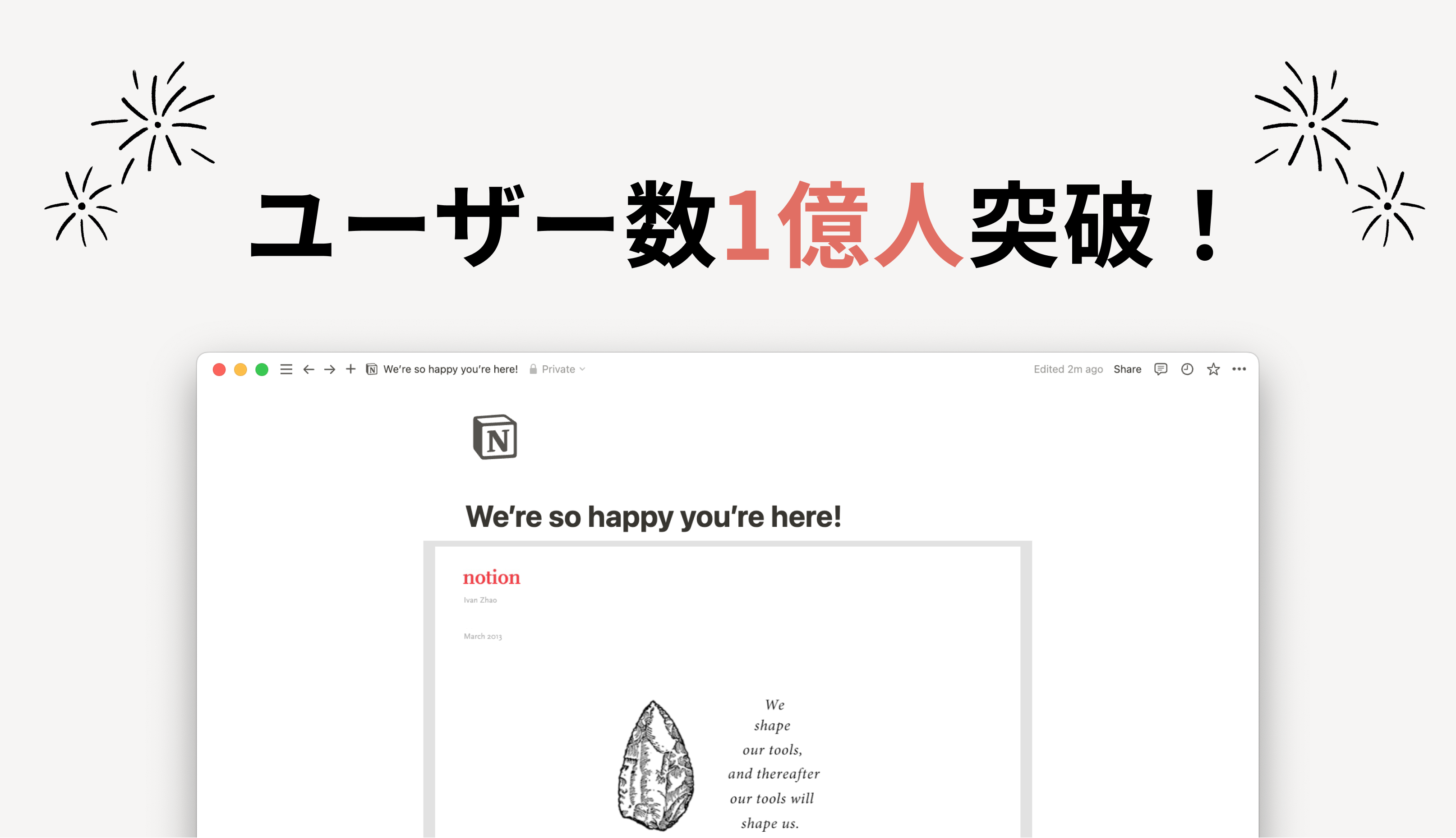 共同創業者兼CEOのアイバン・ザオ(Ivan Zhao)と共同創業者のサイモン・ラスト(Simon Last)は2015年に事業に失敗し、再出発の場として京都を選び、職人の細部へのこだわりや日本のホスピタリティーに感銘を受けながら、今のNotionの最初のコードを書きました。そして2016年、Notion1.0をリリース。2020年にはユーザー数が100万人を超え、そこから4年で1億人にまで成長しました。