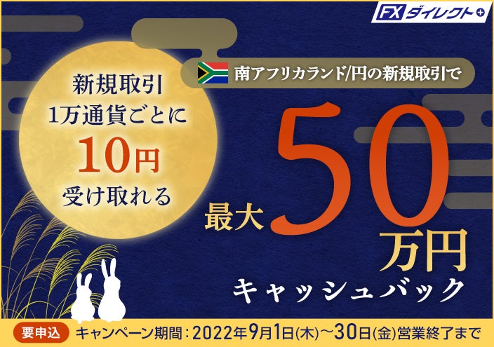 セントラル短資FX株式会社(本社:東京都中央区、代表取締役社長:松田 邦夫)は、2022年9月30日まで南アフリカランド/円の新規取引を対象としたキャッシュバックキャンペーンを実施します。