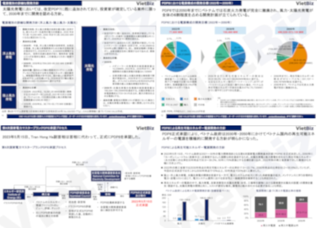 2023年5月15日にベトナム政府によって正式に承認された「第8次ベトナム国家電力計画案を承認する首相決定500号(No.500/QD-TTg)」原文に基づいた統計・データを網羅。その他、ベトナム電力・再生可能エネルギーの最新動向について、商工省、ベトナム電力公社(EVN)、統計総局、現地国営紙の公開情報や聞き取り調査によって得られたデータを精査・分析し、体系的なレポートを作成しております。