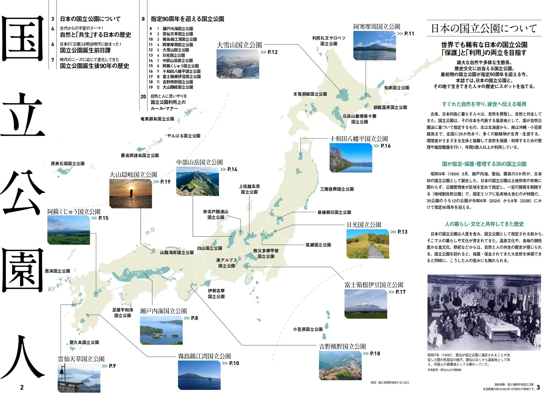 雄大な自然や多様な生態系、歴史、文化に出会える国立公園。最初期の国立公園が指定90周年を迎えた今、本誌では、日本の国立公園と、その地で生きてきた人々の歴史にスポットを当てています。