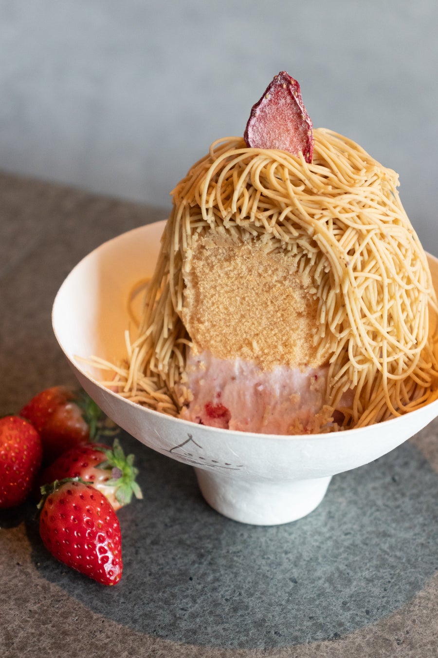 自家製ブレンドのミルクソフトクリームに苺を混ぜ込み、その上から和栗のモンブランクリームを絞ったテイクアウト限定のデザート。