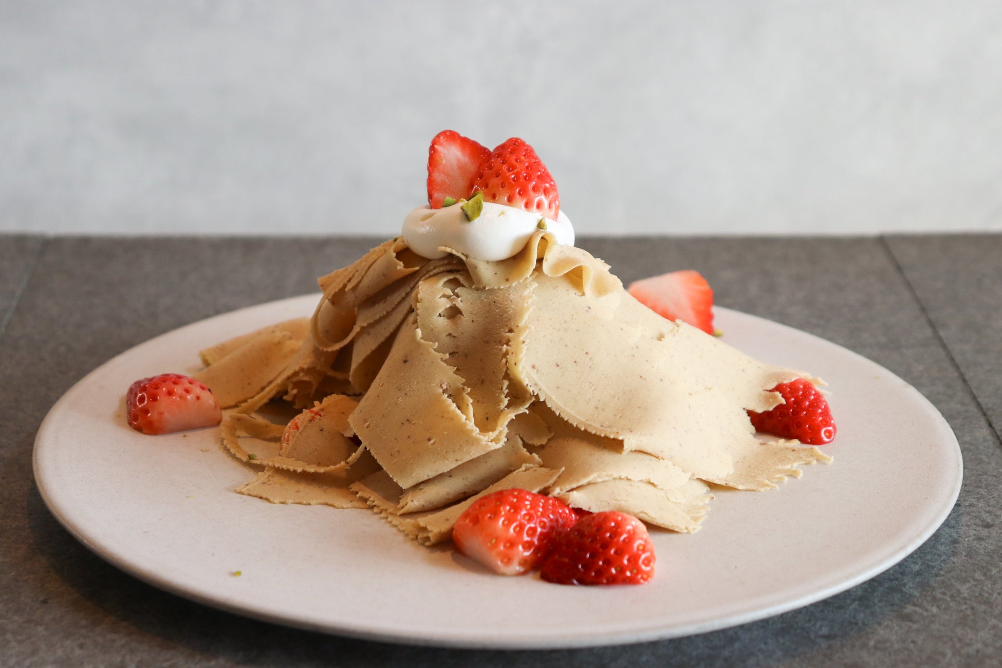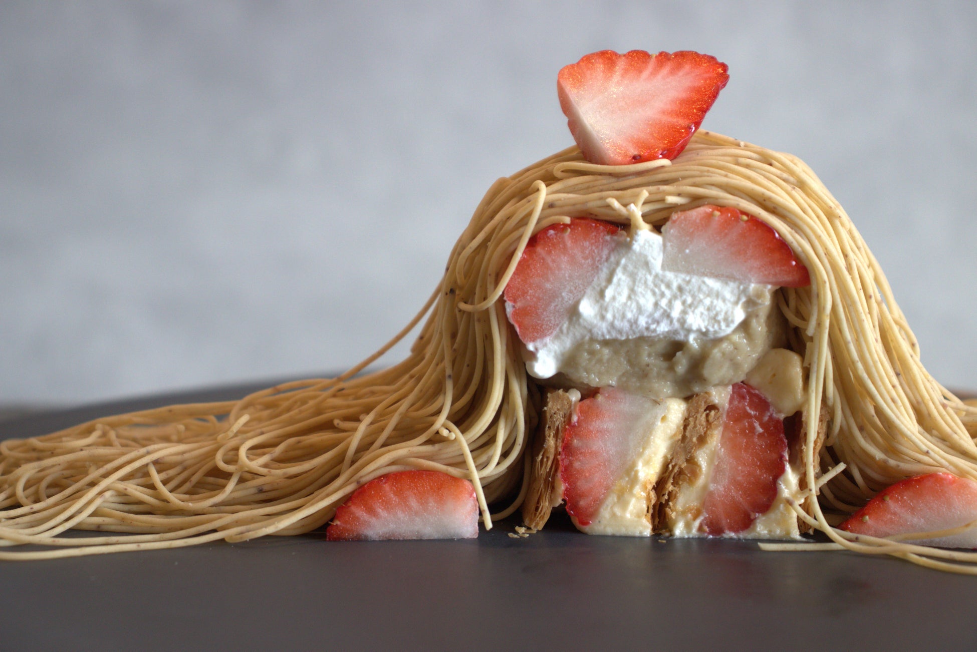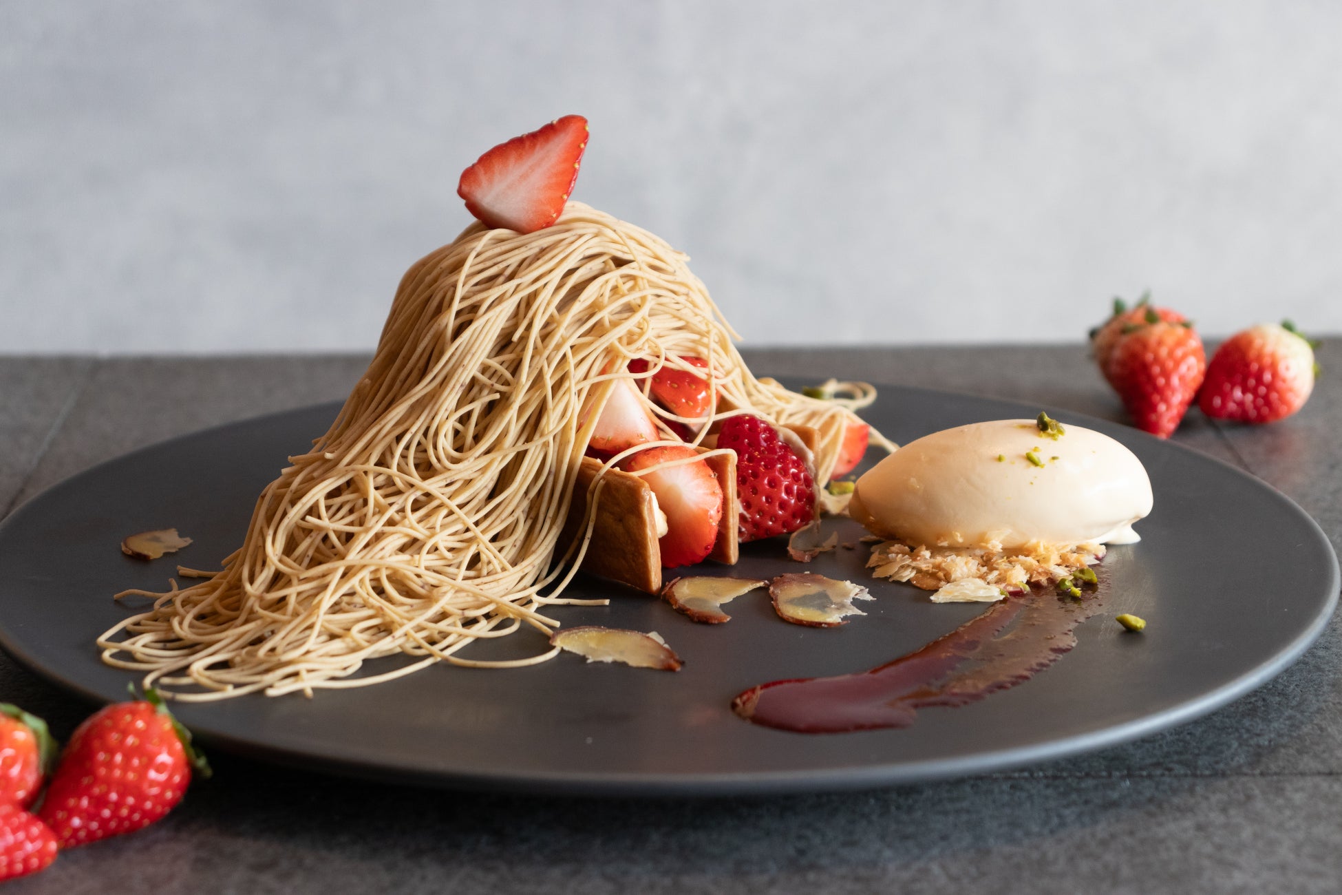 サクサクのパイと甘酸っぱい苺をふんだんに使用したミルフィーユの上から錦糸モンブランクリームをお絞りし、自家製バニラアイスクリームを添えた春限定の特別なモンブランです。