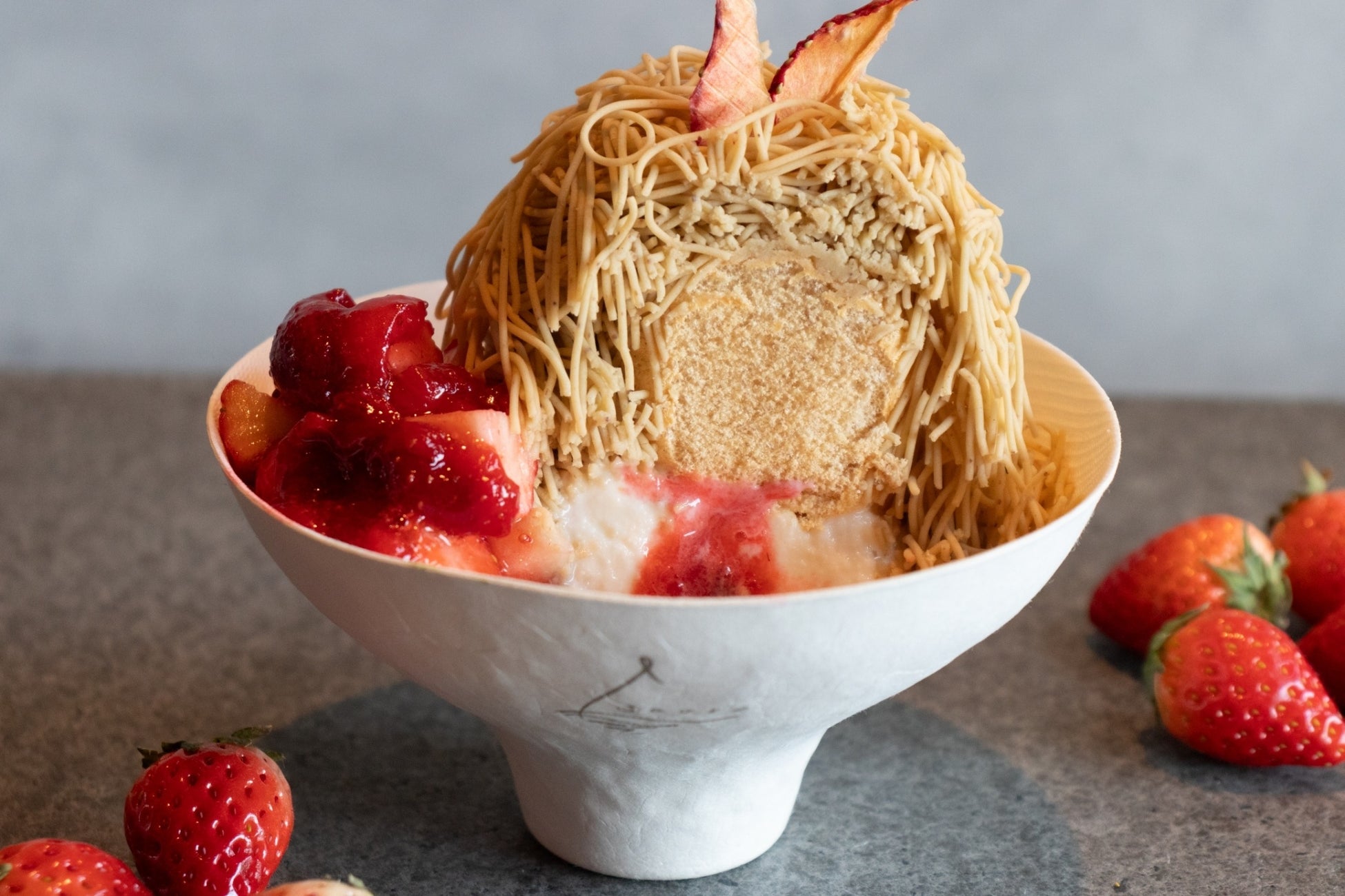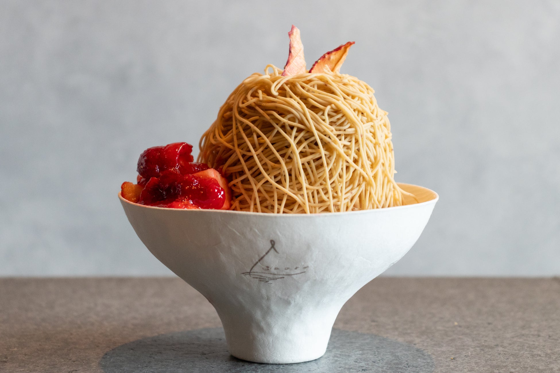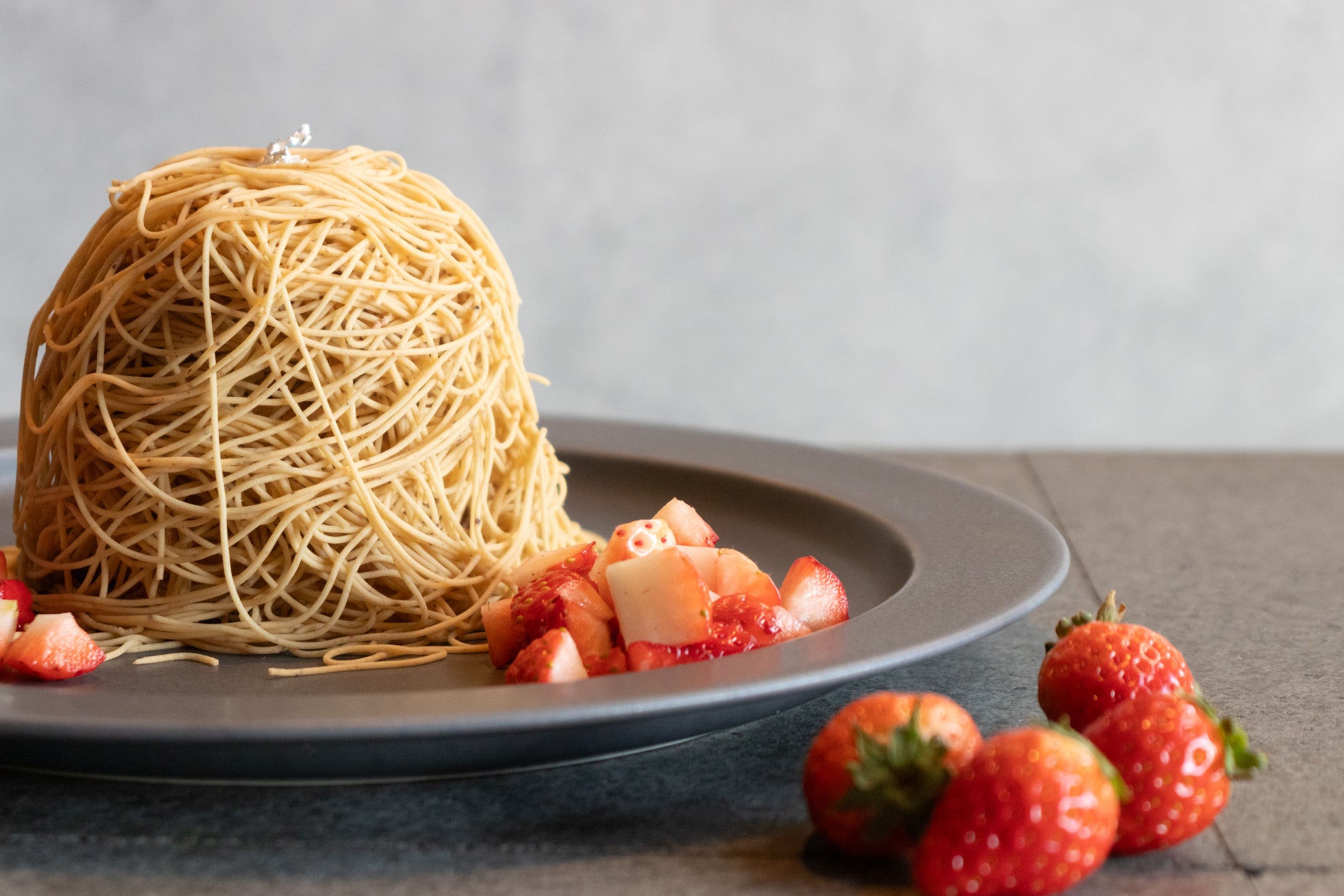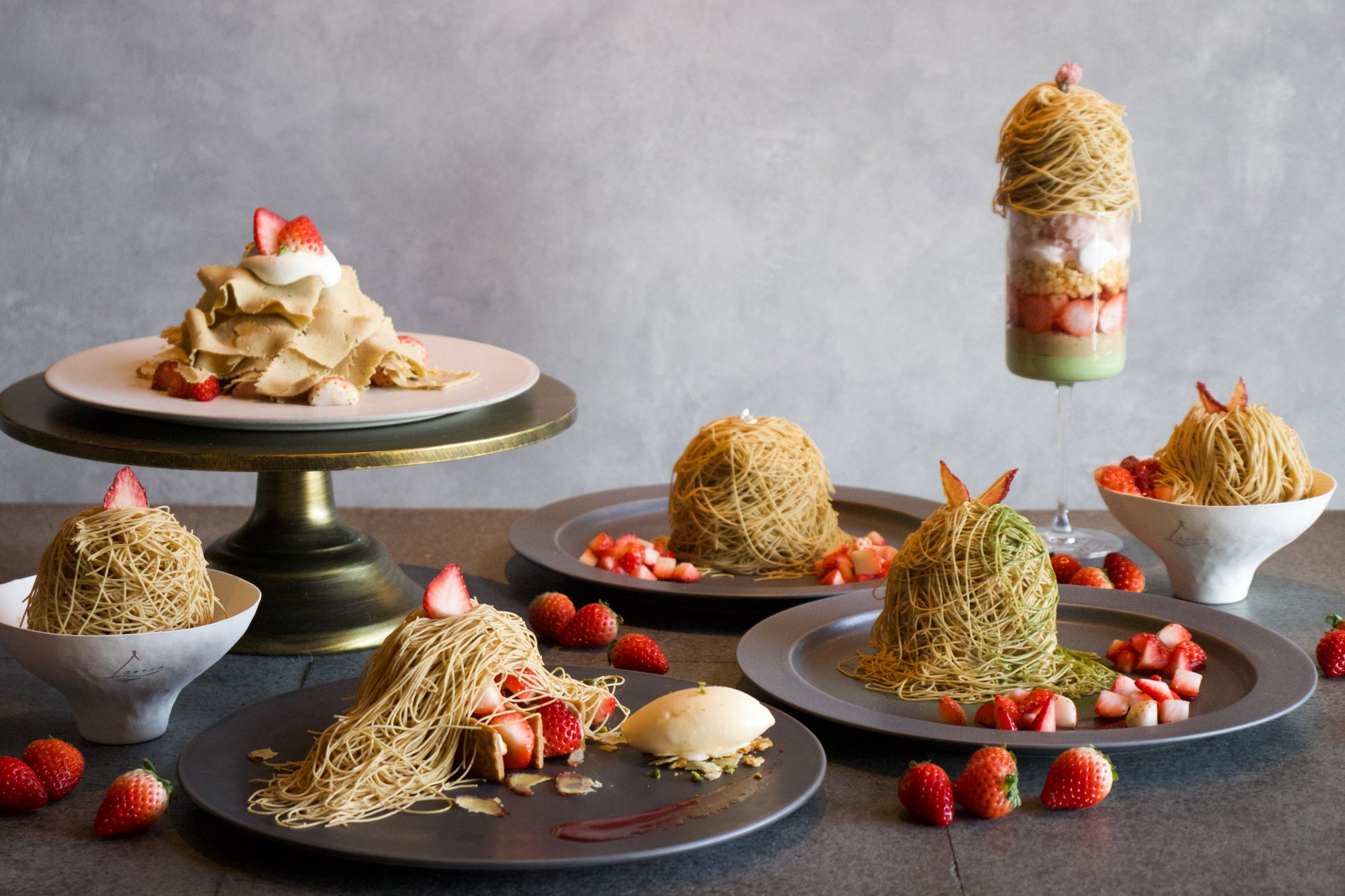 和栗と苺のムースケーキをベースに使用した錦糸モンブラン。国産の苺と和栗のマリアージュをお愉しみください。