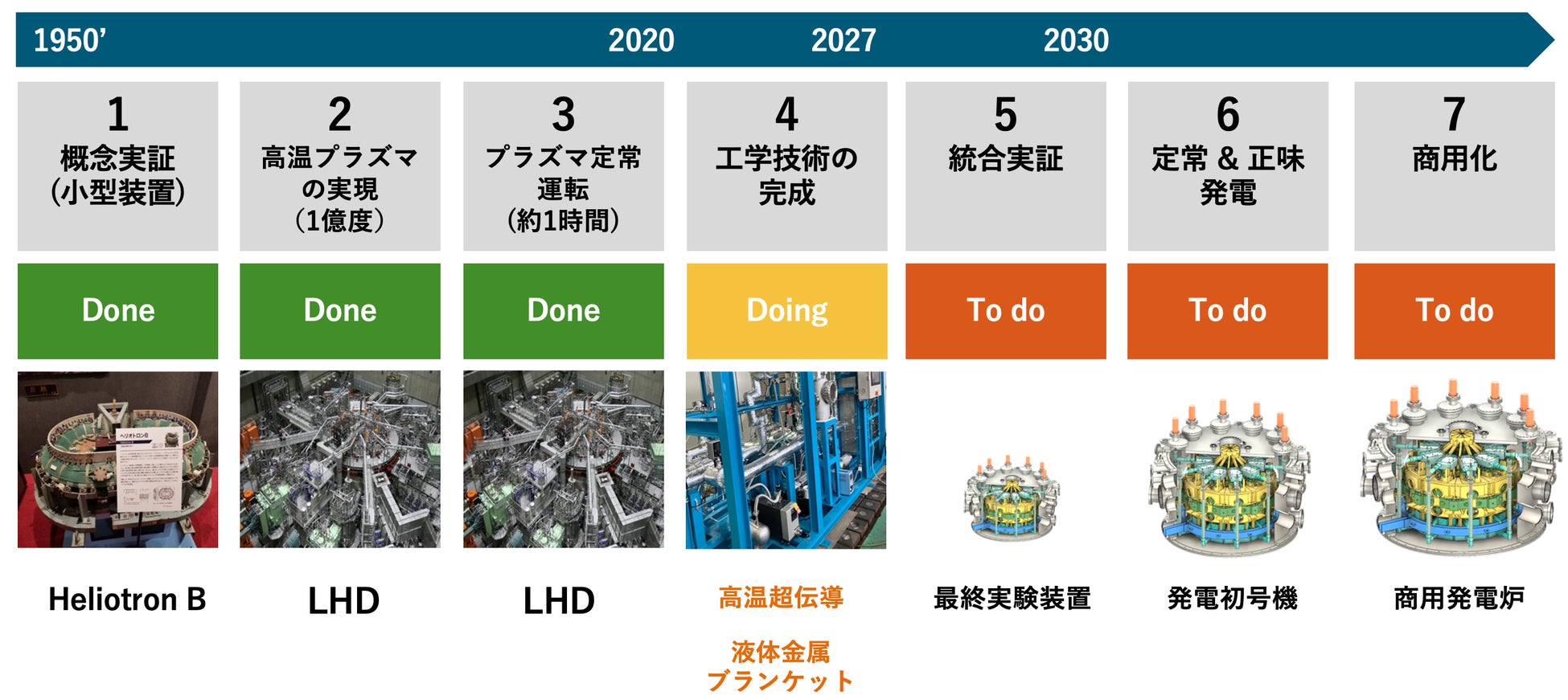 Helical Fusionは、世界初の定常(通年稼働)・正味発電が可能な核融合炉を2030年代に実現、世界に先駆けて商用化してゆくことで、真に持続可能で高効率なエネルギー源の実用化を目指しています。