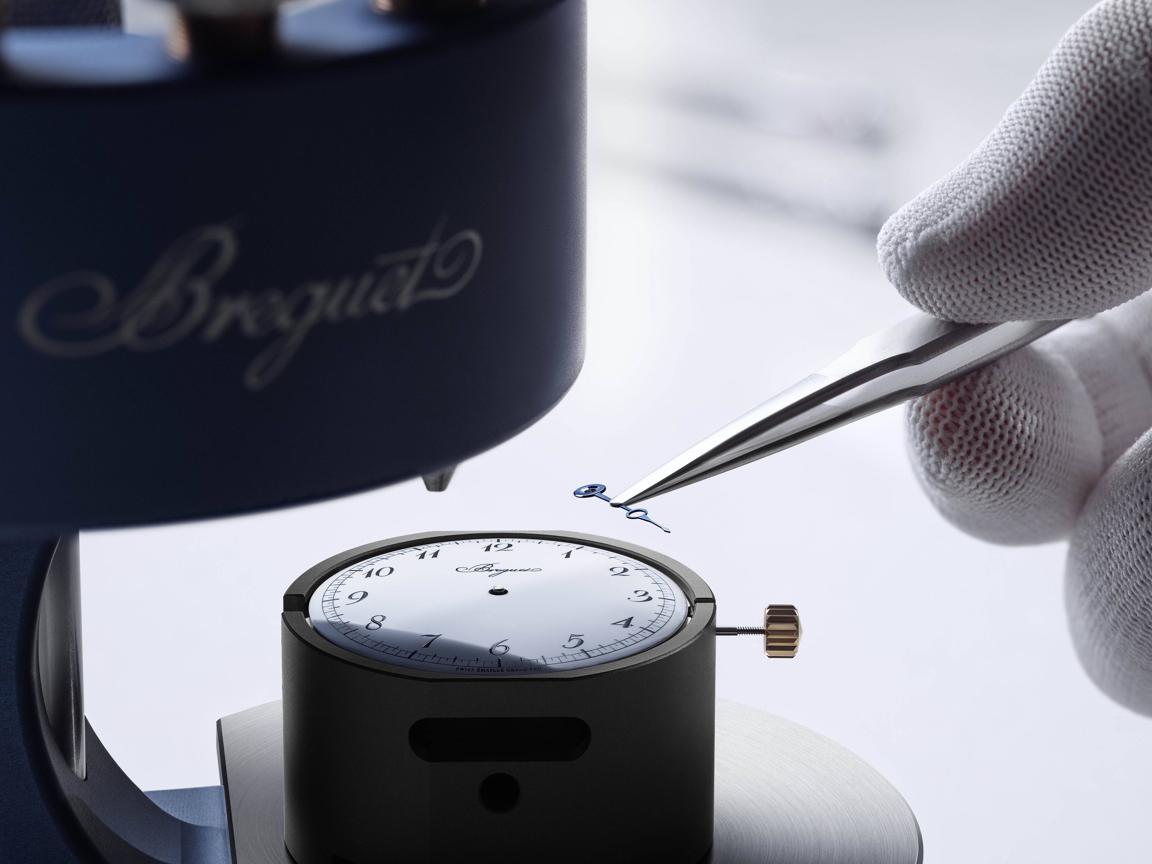 光の加減によって、文字盤の中央と6時位置の間に「Souscription」の文字、固有のシリアルナンバー、シークレット・サインが控えめに浮かび上がります。オリジナルの「スースクリプション ウォッチ」で普及したこのサインは、ブレゲ・マニュファクチュールの作品であることを証明し、偽造を防ぐ役割を果たしました。この作業に使用されるのは、アブラアン-ルイ・ブレゲの時代と同様に、関節式のアームを備えた精密な工具ダイヤモンドポイントのパンタグラフです。これにより、本物であることの証をエナメルに繊細にエングレービングしています。