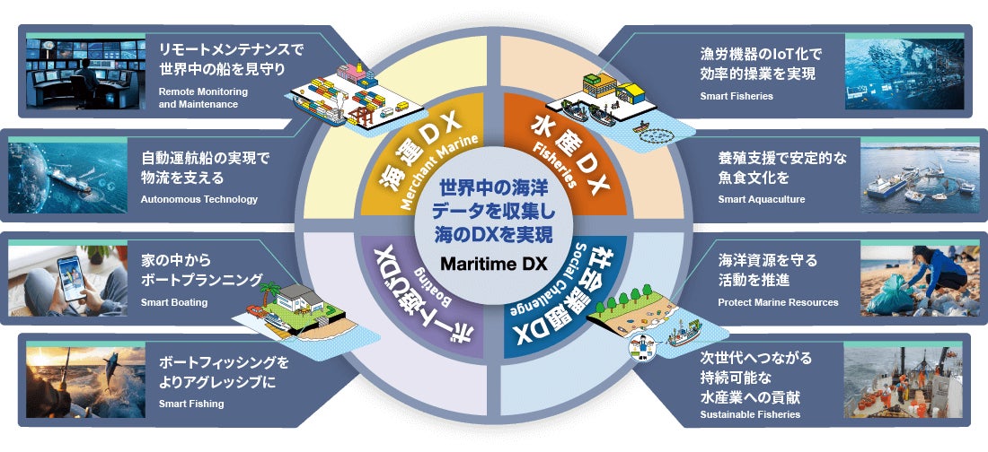 当社の主要三市場である商船、漁業、レジャーそれぞれで、デジタル技術を活用してステークホルダーと繋がり、既存事業にさらなる価値・体験を生み出していきます。さらにこれまでとは異なる市場やお客様に対して提供できる価値創造に向けて、中長期で取り組みを進めています。