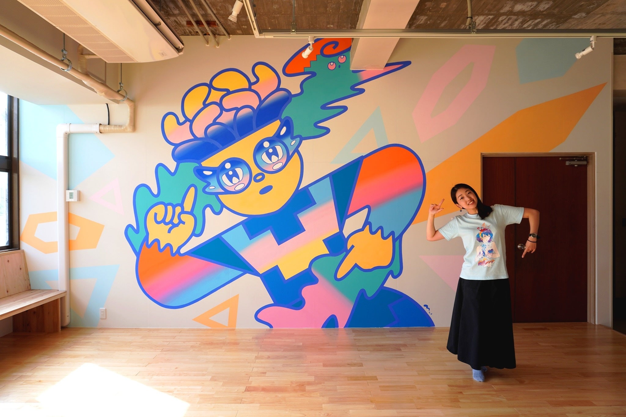 この度、移住後の最初の作品として、大島の旧行政センター跡地をリノベーションし当社が運営しているシェアレンタルスペース「umiba 」の壁画「PRISM」が完成し公開されました。