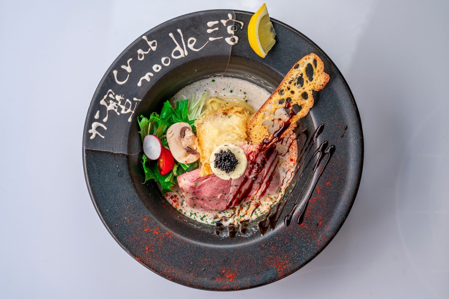 特注の平打ち麺がスープと絡み合い、中心には上質な蟹のほぐし身、低温調理したチャーシュー、特製の蟹味噌バターが重なり合います。
