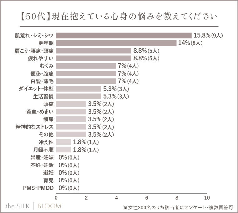 一方で50代になると更年期症状が2位にランクインし、女性ホルモンの急激な減少が様々な身体的・精神的変化を起こしている傾向。