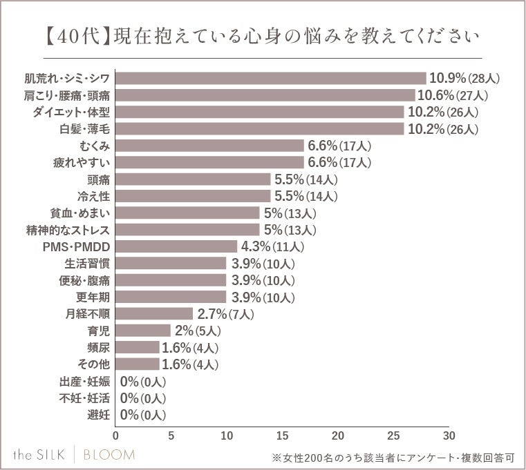 年を重ねるごとに新陳代謝が低下するため、年々増える肌や体型の悩みが大きな不安要素となっているようです。