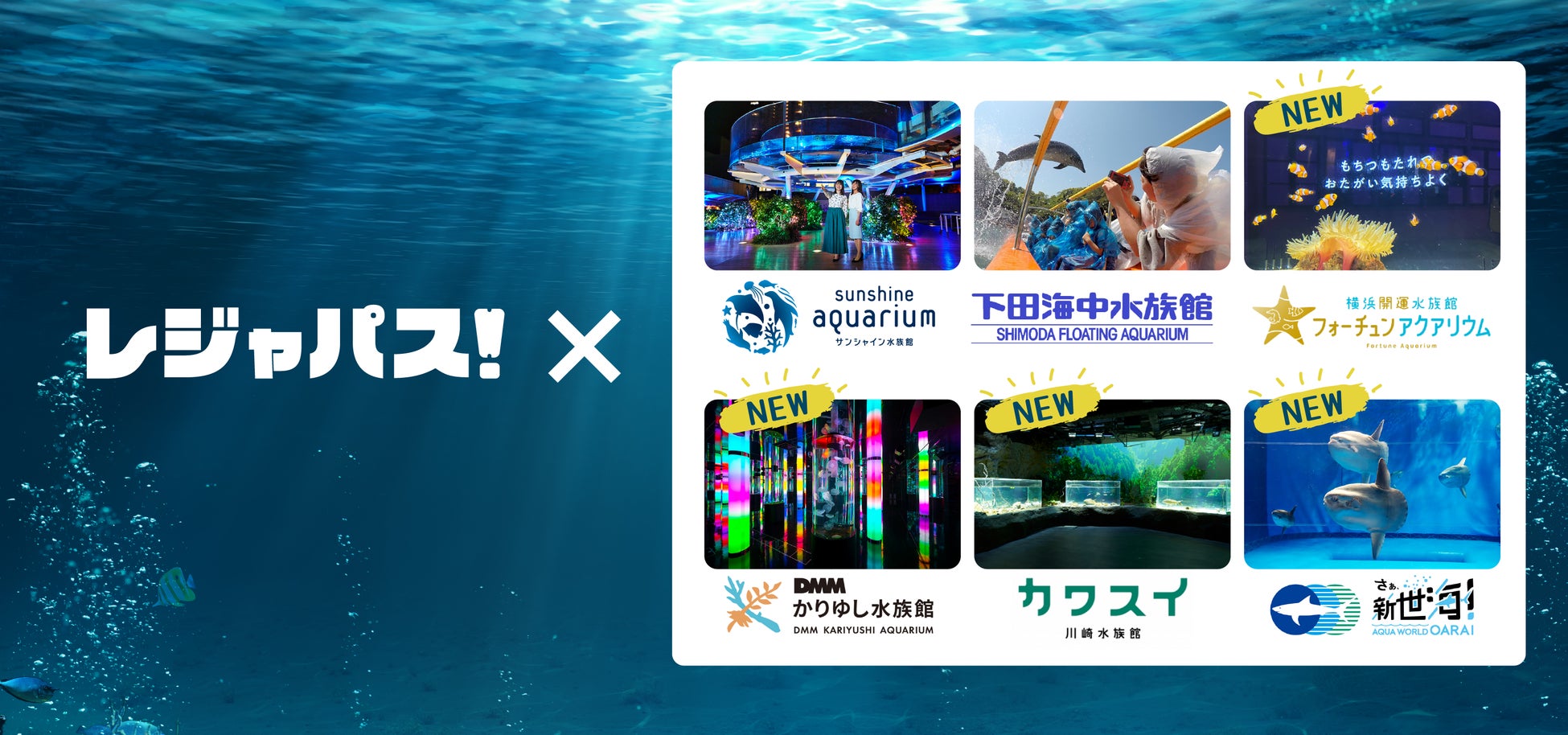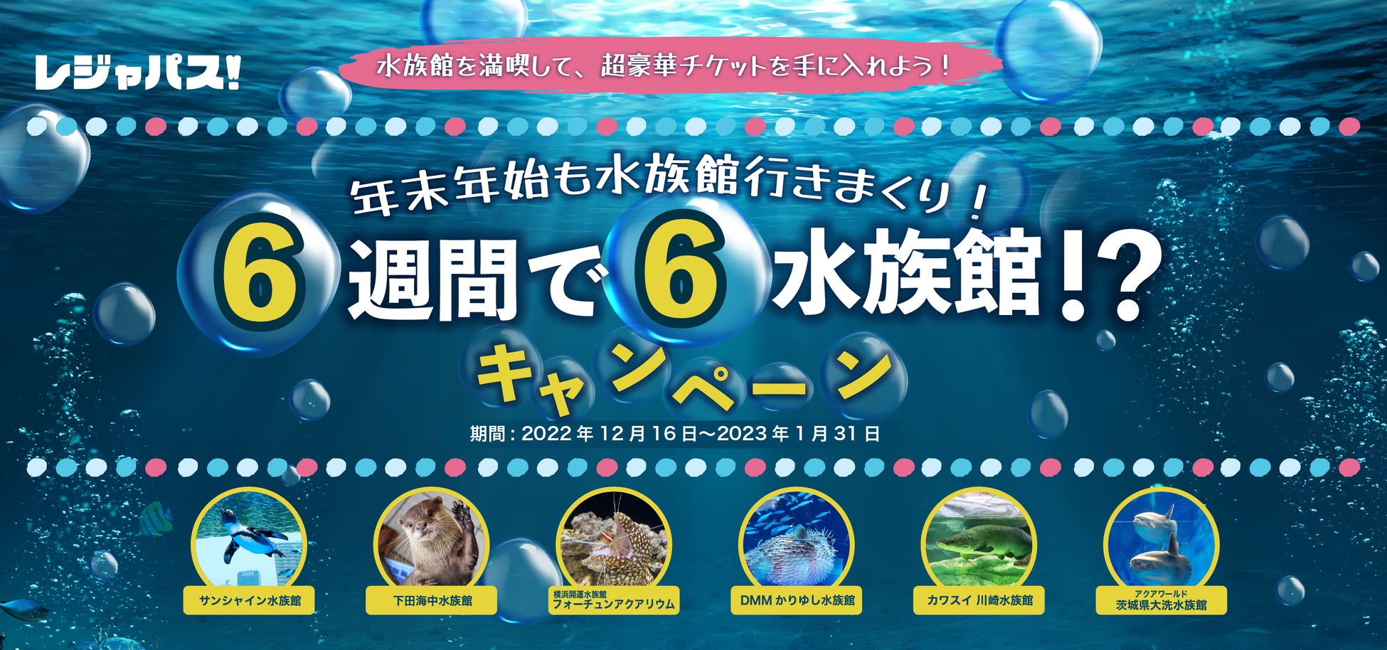 日本最大(※)のレジャー・エンタメ定額制遊び放題サービス「レジャパス」を提供する株式会社ORIGRESS PARKS(本社:東京都品川区、代表取締役社長:吉武優)は、この度レジャパスに4つの水族館が新たに加盟(横浜開運水族館 フォーチュンアクアリウム、DMMかりゆし水族館、カワスイ 川崎水族館、アクアワールド茨城県大洗水族館)することを記念したコラボ企画を実施します。すでに加盟しているサンシャイン水族館、下田海中水族館を含めた6つの水族館と「6週間で6水族館!?キャンペーン」を12月16日(金)より開始します。