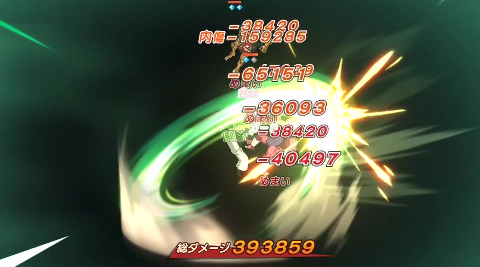 十字範囲の敵に4回攻撃し、200%(+8)のダメージを与える。バトル開始から2ターンの間、疾風猛蹴を発動した場合、100%の確率でランダムな敵2体を1ターンの間、効果命中と効果回避を無視して[めまい]状態(敵が行動不能になる)にする。戦意を-900Ptする。