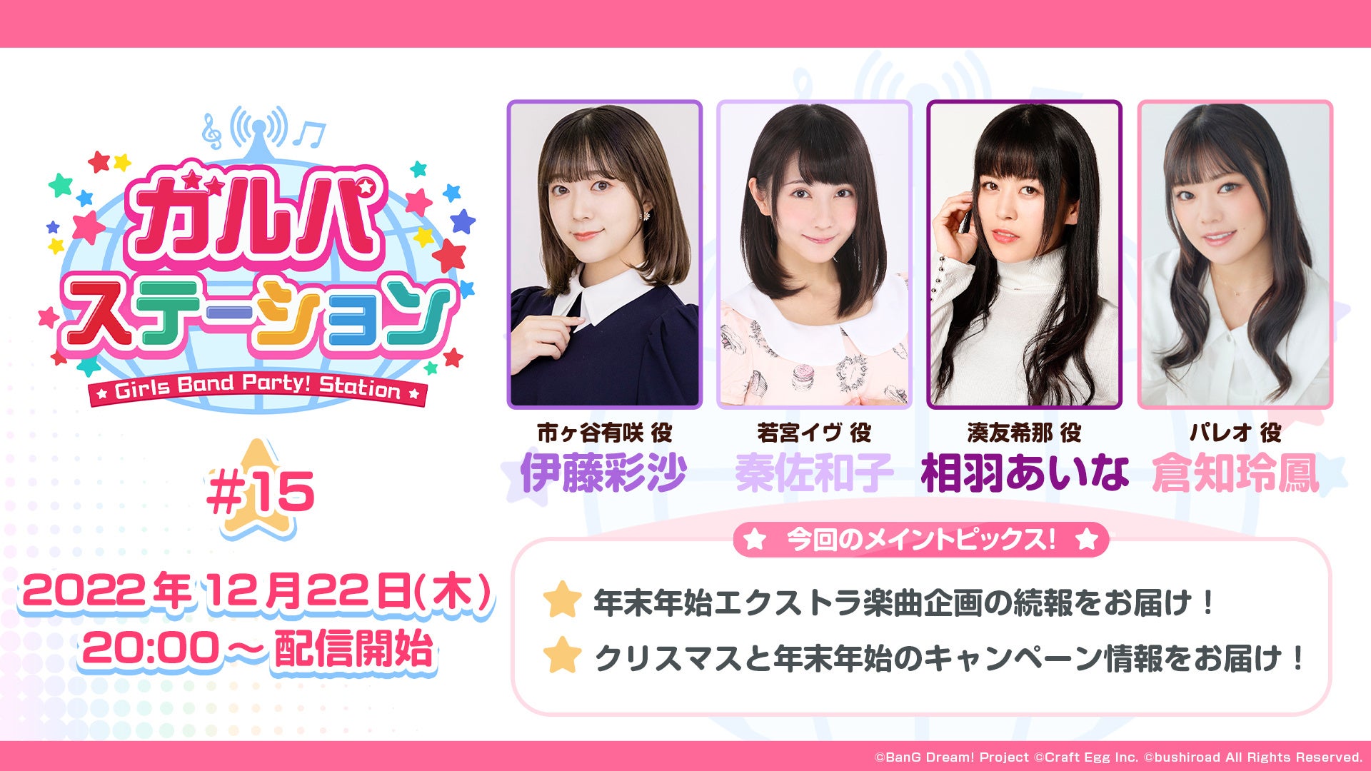 株式会社Craft Egg(本社:東京都渋谷区 代表取締役:森川 修一、以下、Craft Egg)と、株式会社ブシロード(本社:東京都中野区 代表取締役社長:木谷 高明、以下、ブシロード)の共同制作によるスマートフォン向けゲーム「バンドリ! ガールズバンドパーティ!」(以下、ガルパ)は、12月22日(木)20時より配信の「ガルパステーション #15」にて、年末年始エクストラ楽曲企画の続報や、クリスマスと年末年始のキャンペーン情報などをお届けいたします。ぜひご覧ください。