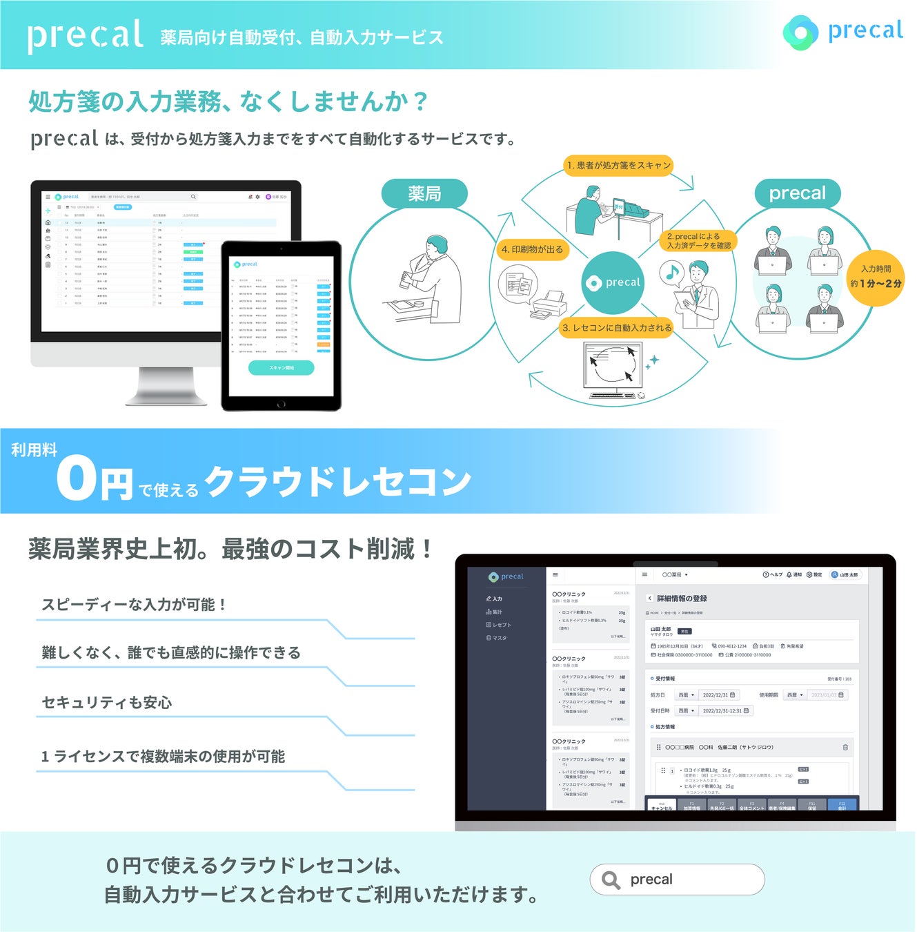 薬局最大の事務作業をなくし、医療ビッグデータのプラットフォーム化を目指しております。薬局向けのオンライン事務員による処方箋入力代行サービス「precal」を提供し、直近ではクラウド型レセコンのサービスも開始しました。