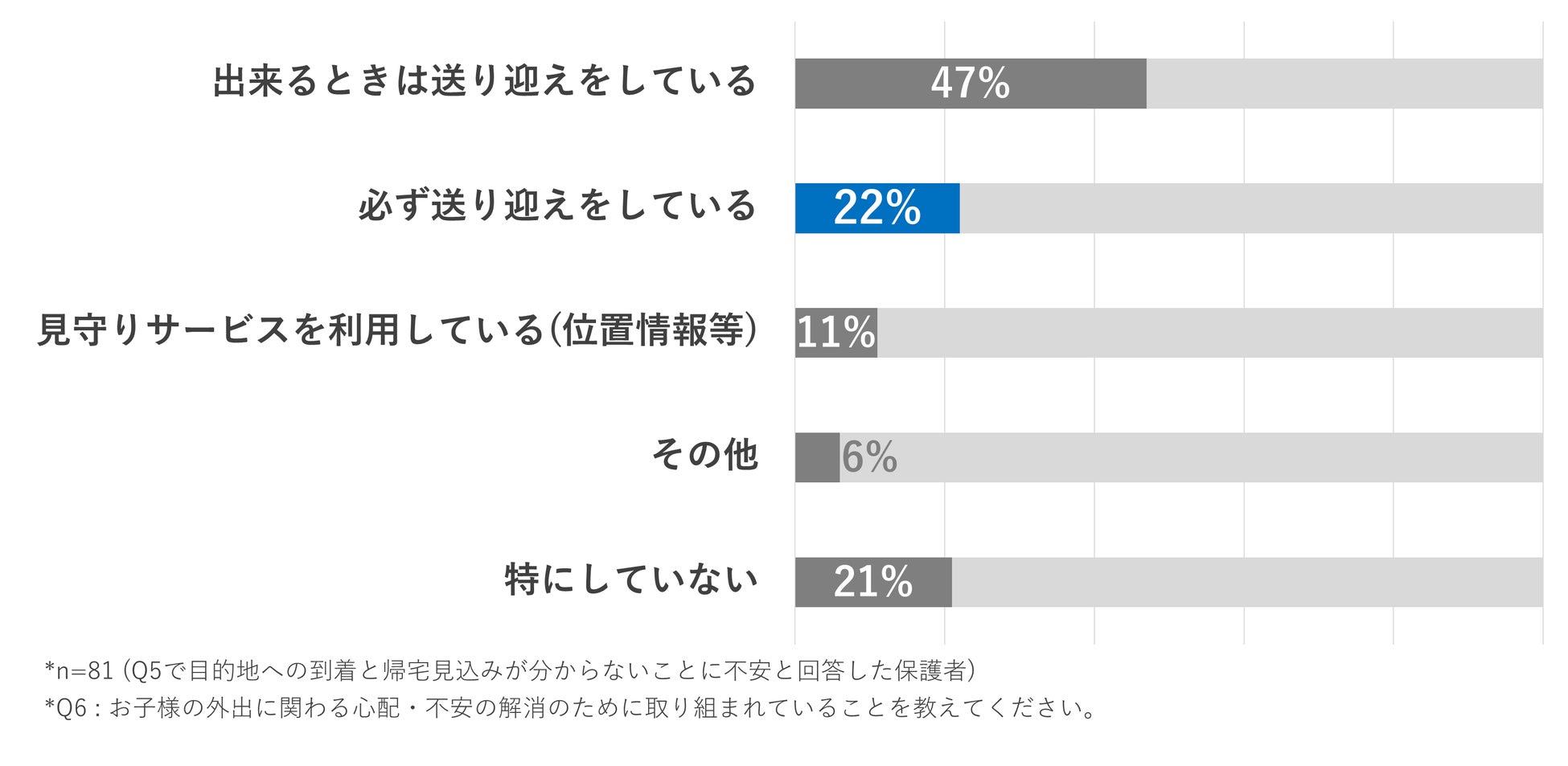 - 約80%の保護者が、不安を抱えながらも送迎を必ずは出来ていない