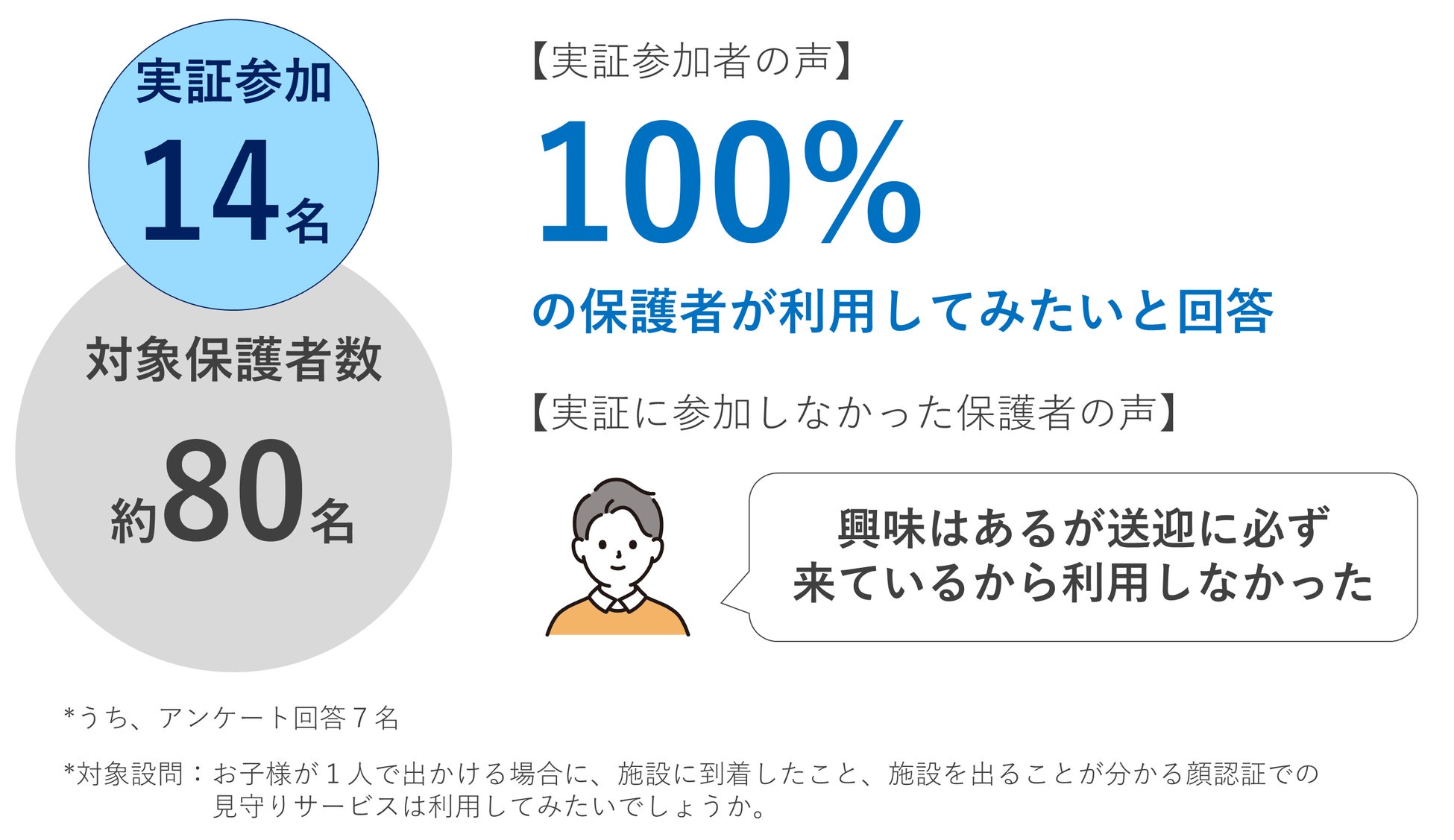 一方で、実証不参加の保護者から「興味はあるが送迎に必ず来ているから利用しなかった」という声を頂いた通り、約80名の対象保護者のうち、実証参加が14名に留まっており、保護者が自ら送迎する施設だとニーズが限定的になることが分かりました。