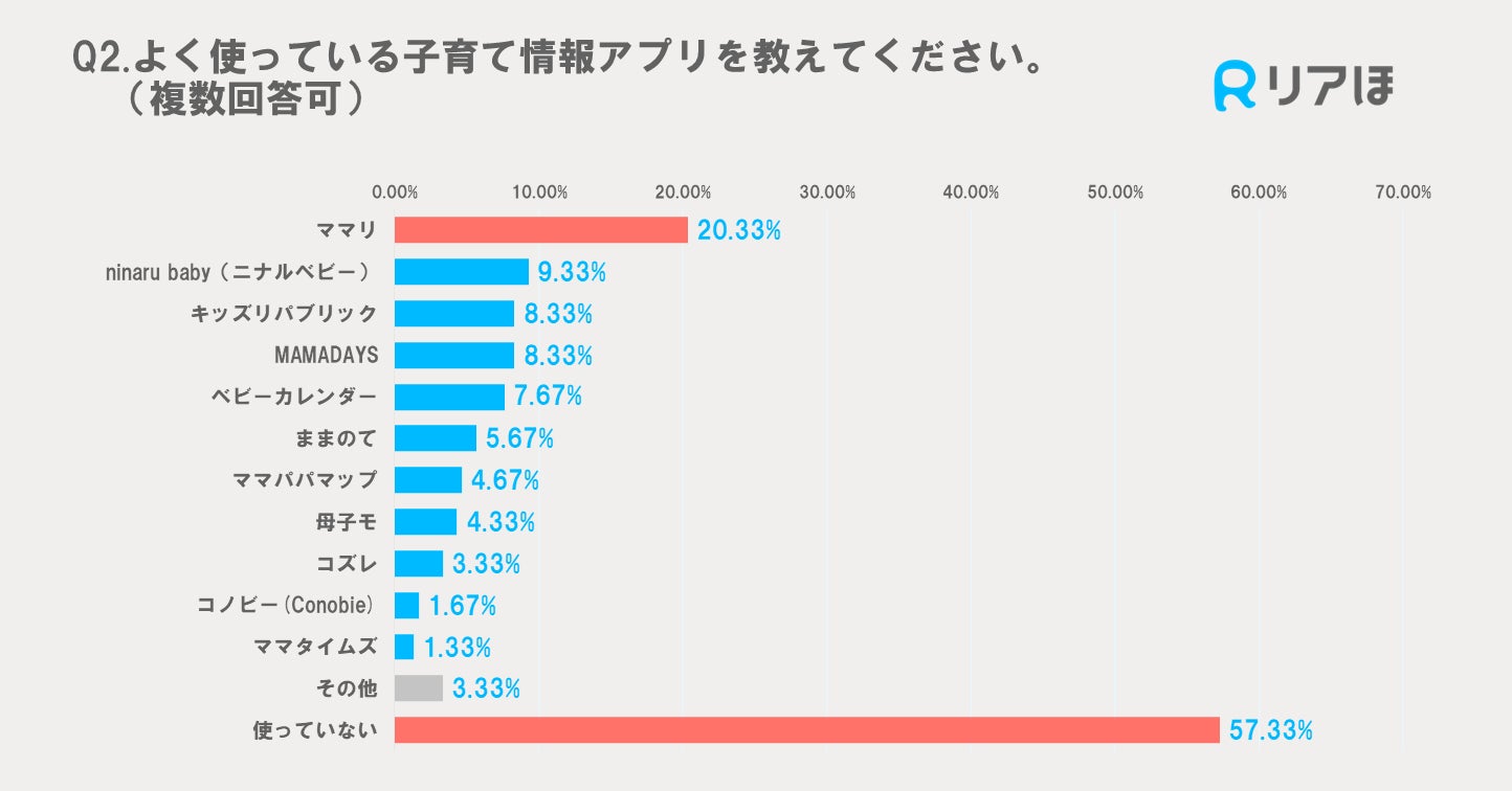 最も使用されているアプリは「ママリ」の20.33%となり、圧倒的に利用者数が多い結果となりました。