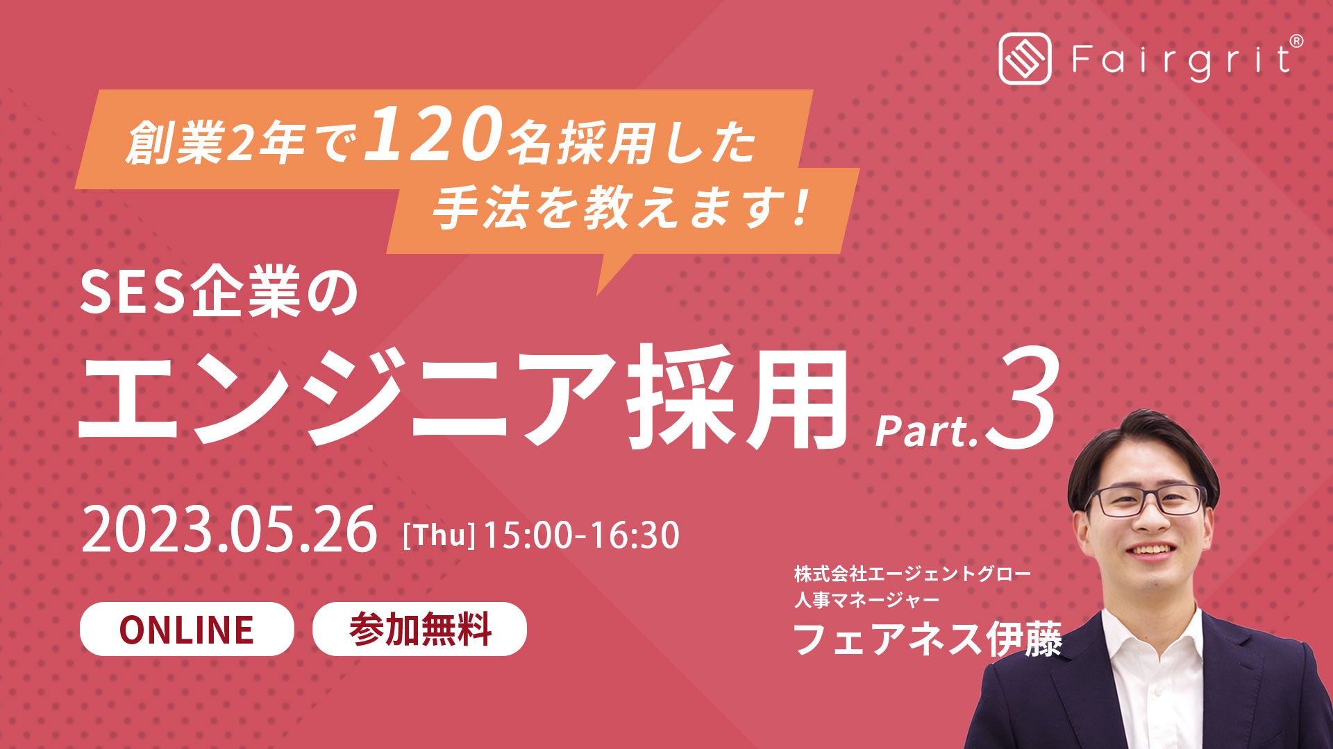 株式会社エージェントグロー(本社:東京都港区、代表取締役:河井智也/以下、「当社」)が毎月開催しているSES企業様を対象にした無料オンラインウェビナーにつきまして、2023年5月度の開催内容と日程が決定いたしました。