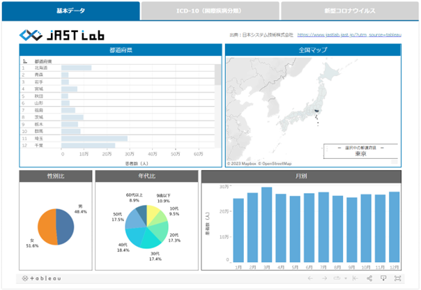 本ダッシュボードにて公開するデータは、「基本データ」「ICD10(※2)別データ」「新型コロナウイルスデータ」の3種類から構成されています。それぞれ都道府県別にデータを可視化し、性別や年代といった属性の比率と月別の患者数を確認することが可能です。実際のダッシュボードでは都道府県をクリックすることでそのエリアにおけるデータを確認できるような直観的に分かりやすいものとなっています。