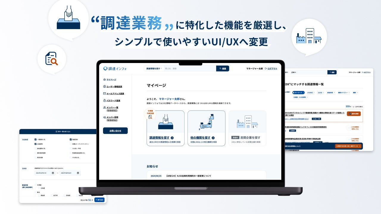 「調達インフォ」はこれまで入札情報速報サービス「NJSS」と共通のプロダクトとして提供されておりましたが、このたび「調達インフォ」独自のプロダクトとしてリリースし、サービスサイトを全面リニューアルされました。「他機関の仕様書」や「落札・応札企業の情報」の検索・閲覧など調達業務に特化した機能を厳選しており、公的機関の職員の方にとってより使いやすい設計となっています。