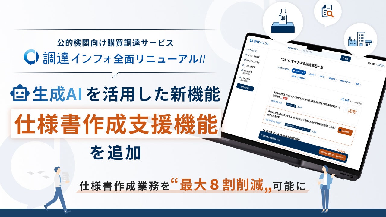 本リニューアルでは、公的機関の調達業務を効率化する、生成AIを活用した「仕様書作成支援機能」が新たに追加されております。また「調達インフォ」の有料導入公的機関数が、2024年9月末時点で100機関を突破したことも併せてお知らせいたします。