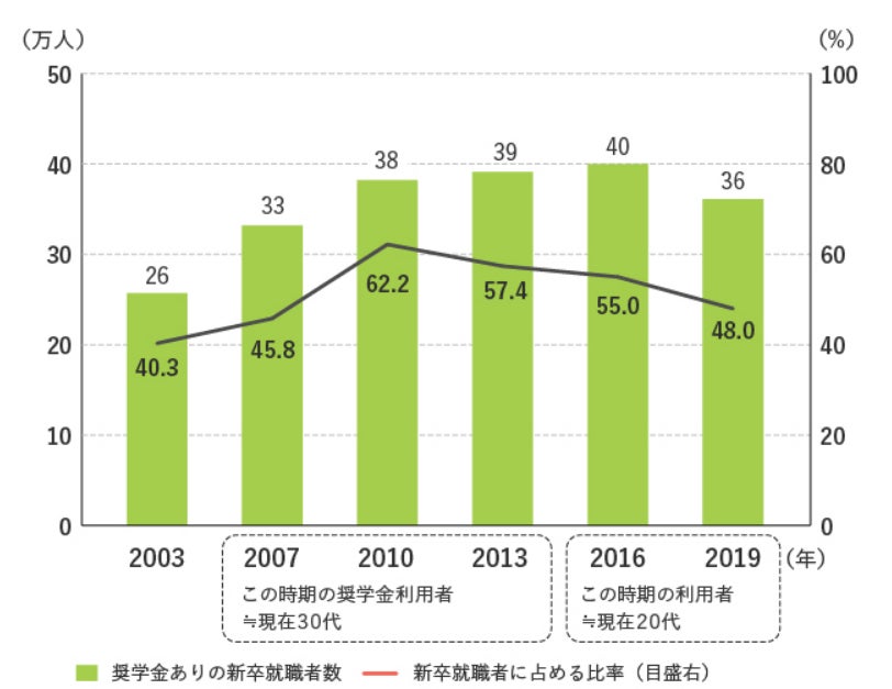 奨学金返済を抱えて社会人となる人の推移