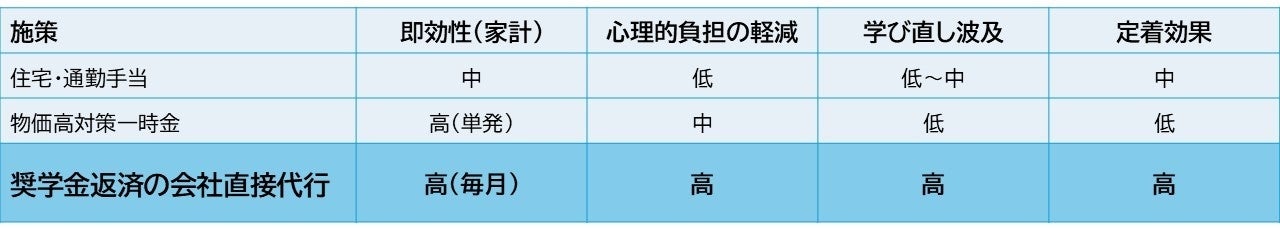 多くの手当は「生活費を広く薄く支える」性格ですが、奨学金返済の会社“直接”代行は、若手の家計を最も圧迫する固定費そのものを毎月消す設計です。立替・精算の手間もなく、心理的負担と事務負担を同時に解消。可処分所得を即時に回復させ、「辞めない理由」と「挑戦できる余白」を同時に生みます。