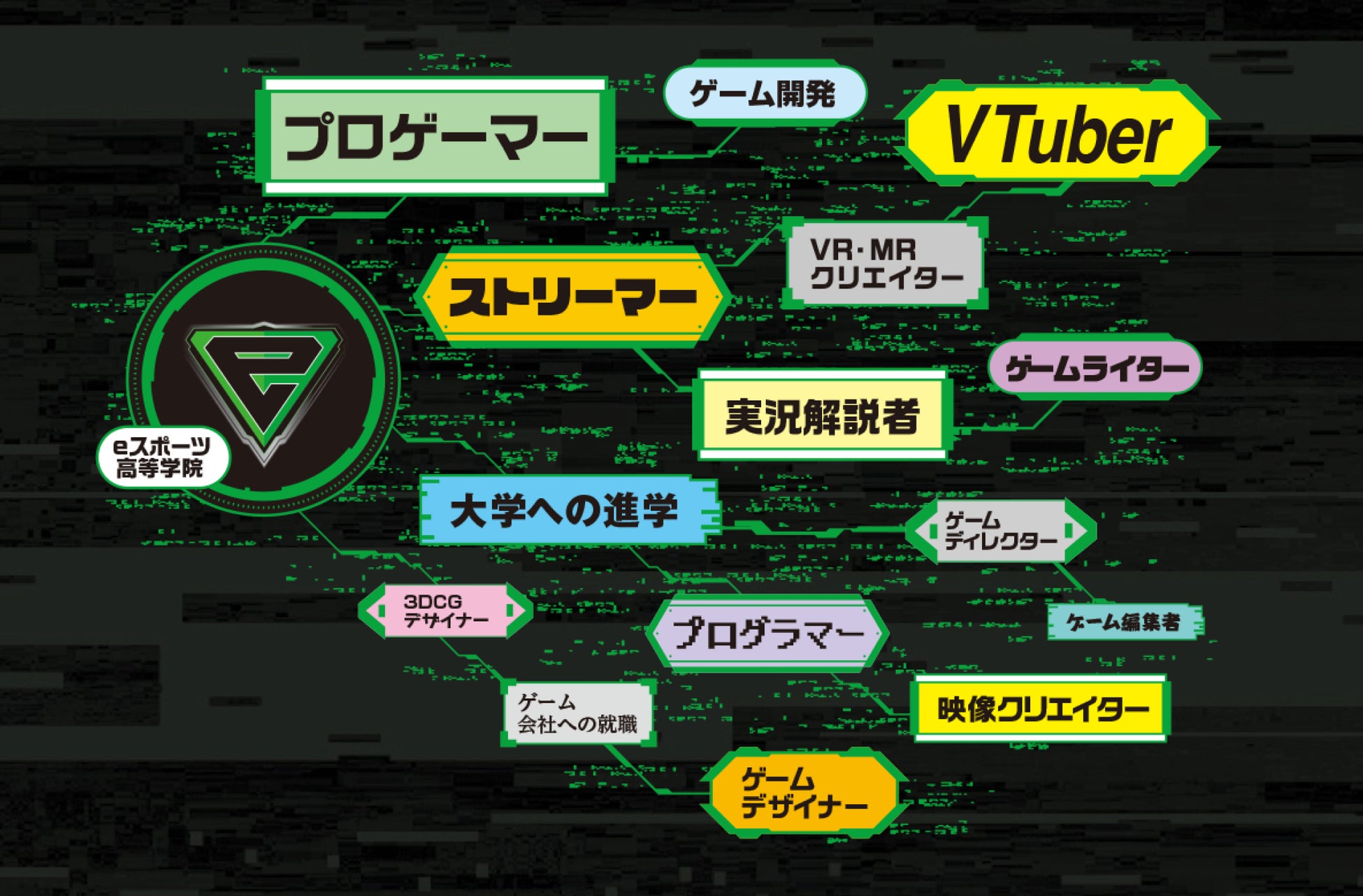 学校名:eスポーツ高等学院(シブヤeスタジアム、ブクロeスタジアム、ヨコハマeスタジアム、ナゴヤeスタジアム、ハカタeスタジアム、クマモトeスタジアム、カゴシマeスタジアム)