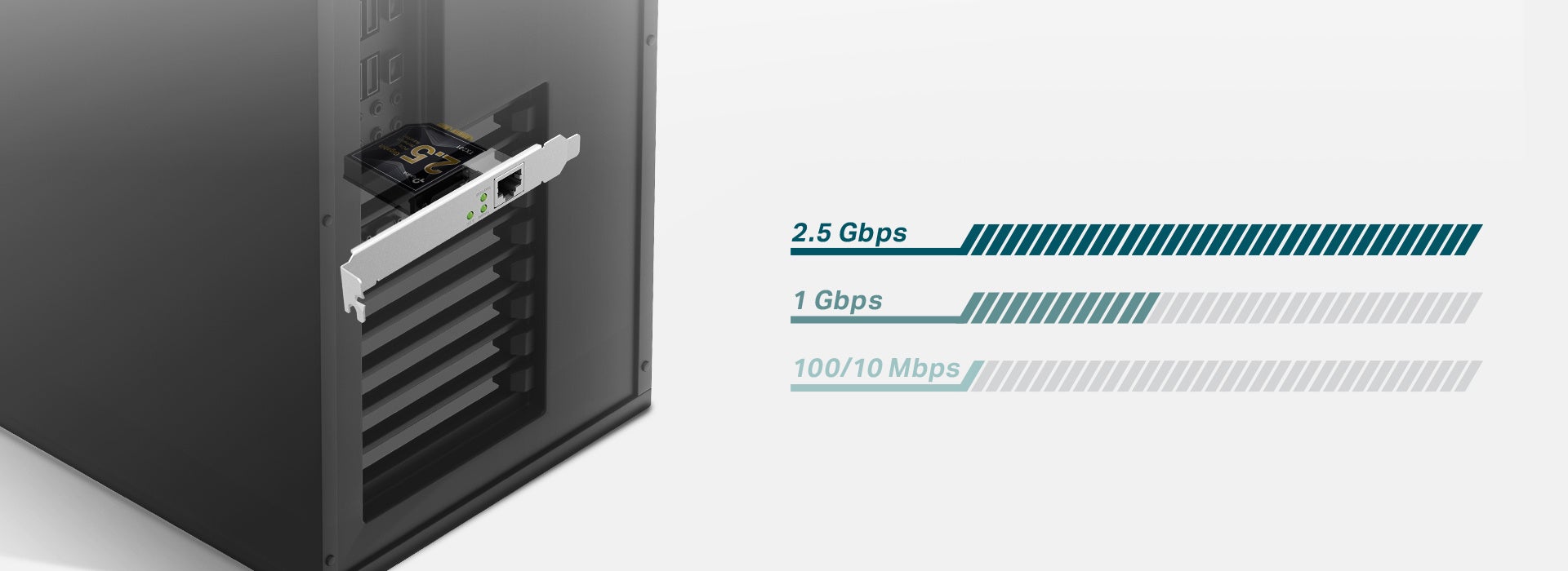 2.5G Base-Tは、2.5Gbps・1Gbps・100Mbps・10Mbps Base-T規格とも下位互換性があります。これらのポートと接続した際には自動で認識して対応速度を調整するので、互換性や設定変更に悩まされることなくネットワークのアップグレードが可能です。