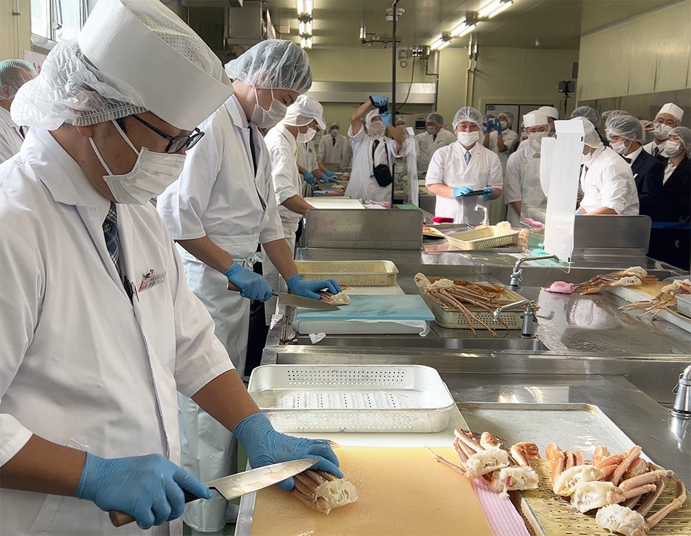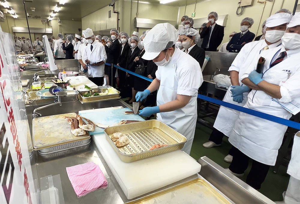 株式会社かに道楽(本社:大阪市)では、毎年、全41店舗で予選会を行い、タイム上位24名を集め、かに切り大会決勝と題し、チャンピオン決定戦を行っております。第一回大会が1994年で、コロナ禍での未開催を含め、今年で29回目を迎える。審査は「早くて・綺麗」が基本で審査基準は細かな項目に分けられる。本年度は6肩の切上がりで競い、関節部分がきれいにカットされており箸が通りやすいか、脚をカットする角度、爪がきれいに割れているか、などなどの審査があり、基準を満たさない「かに」に関しては、それぞれにペナルティーが課せられ、実際切上がったタイムとペナルティーを合わせた合計タイムで競い、チャンピオンを決定する。かに道楽では鮮度に拘り、切上がりからお客様に提供するまでの時間を出来る限り短くし、美味しいかにをお客様に召し上がって頂く為に、日々調理人は考えており、早く、綺麗にかにを切る事は、かに道楽の料理人としては外せない要素であります。そのような中、本年度も緊張感の中、鳴り響く鼓動とともに、静寂のためより心地よく聞こえる包丁がまな板にあたる音がリズミカルに「トントントーン」と流れ、手に汗握る戦いがありました。そして本年度はかに道楽京都伏見店の玉置(たまおき)主任が、料理人約500名の頂点に立ちました。