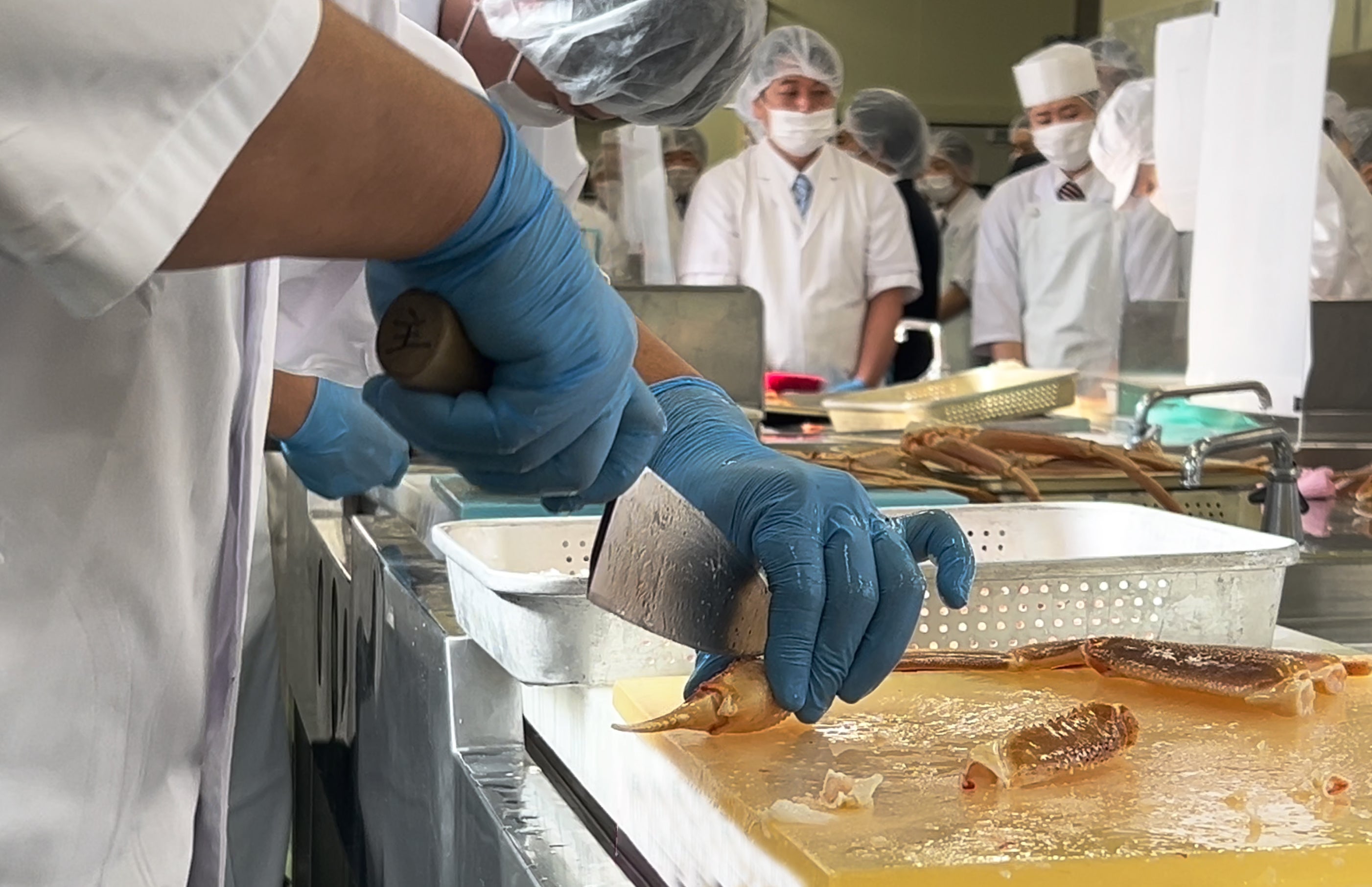 今回、2023年かに道楽全国技能コンテストにおいて、第29代かに切チャンピオンになりました。2019年より返り咲き2度目のかに切チャンピオン受賞となりますが、今回は併せて調理総合種目優勝という、2冠を達成することが出来ました。今回で29回という技能コンテストの歴史の中で、初の2冠達成とのこと非常に光栄なことではあるのですが、誰よりも当の本人が一番驚きを感じています。私自身、入社より30年という時間をかに道楽で過ごし、その中で少しずつ磨いてきた技術が 遅咲きながら、このような形で結果として実を結ぶこととなり非常に嬉しく思っています。今回、技能コンテスト予選通過が決定した後に、決勝に向けて練習を進めていたのですが、 ほんの少しいつもと違うかにの切り方に挑戦してみたところ、思いの外速く切れたことに驚きました 私の中で、これ以上はないだろうな、もう限界かな、と思っていた事がほんの些細な事でこれだけの年数を重ねても、まだまだ出来ることがあると発見出来た事が楽しくて仕方がありませんでした。自身を職人というのはおこがましいのかもしれないのですが、技術、知識の研鑽をし続けていく かにのエキスパートの職人として、この楽しみを探し続けそして、この技術、知識、経験を持ってお客様に最高のかに料理を提供出来る料理人でありたいと思います。