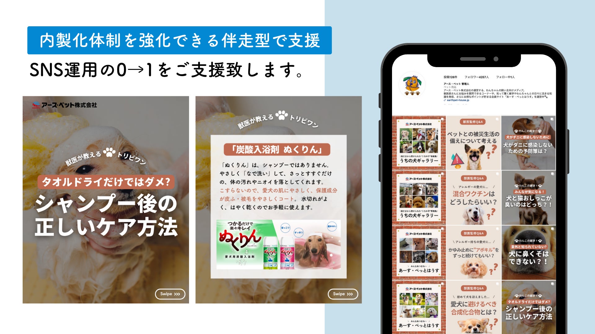 ペットの飼い主様を対象とした事業開発やブランディングの総合支援を行います。デジタルを中心とした企画立案や戦略設計、プロモーションを行います。また、企業様ごとのご課題感に合わせて、ペットに特化した運営チームがトレンド・ニーズ調査を実施し、調査報告も実施しています。