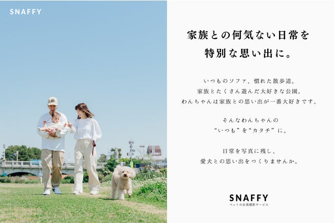 ペットの出張撮影サービス「SNAFFY」は、わんちゃんが大好きな場所、過ごしてきた自宅や公園で撮影など、個人にあった形にカスタマイズできる全国出張撮影が可能です。