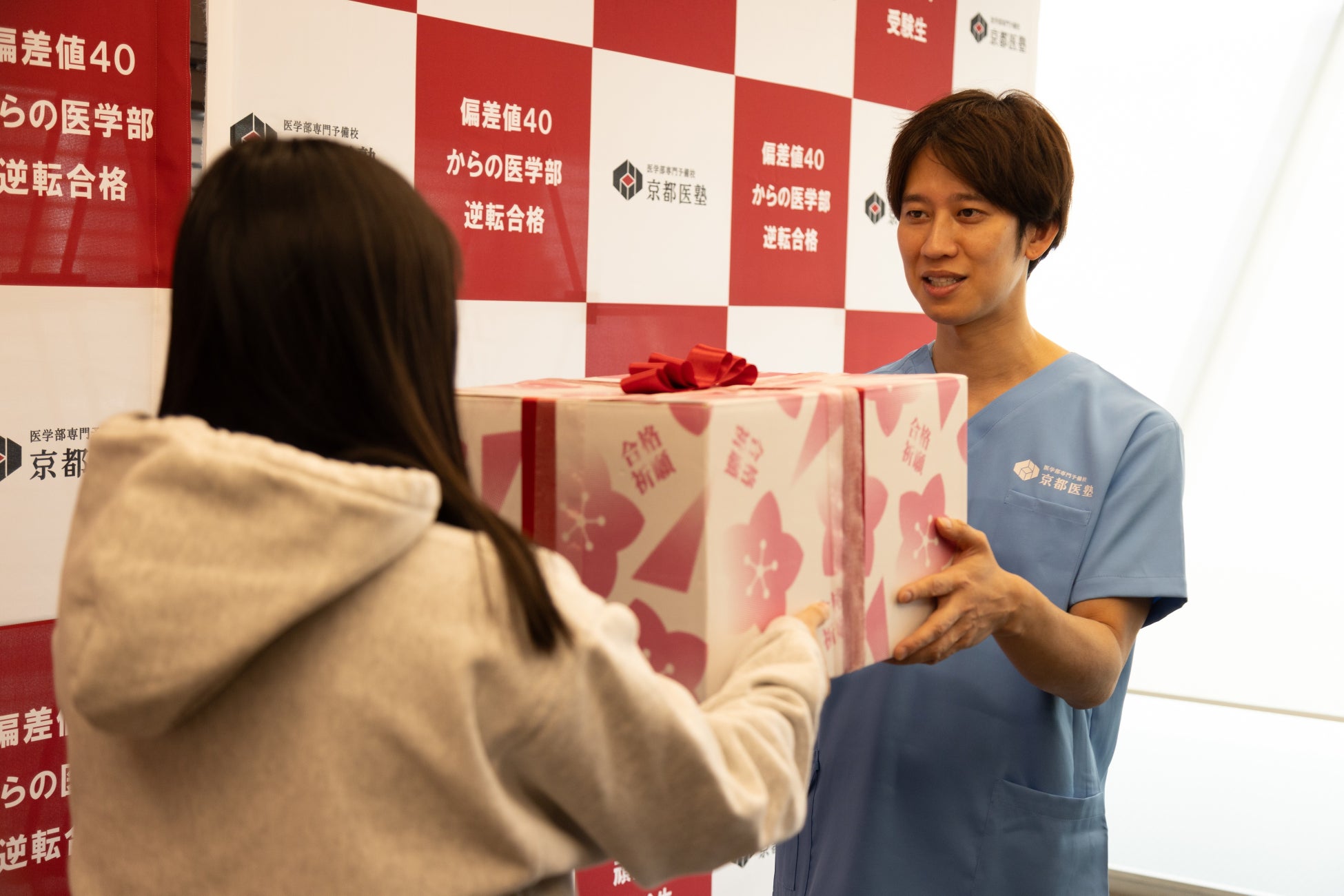 偏差値40からの医学部専門予備校、京都医塾株式会社(本社:京都市中京区 代表取締役 伊藤 章)は、集中力の維持・改善に受験のお供となる「リポビタンD(大正製薬株式会社)」などの受験生活をサポートする商品が詰まった『医学部受験合格祈願応援キット』を制作し、1月18日(土)に行われる大学入学共通テストから受験本番を迎える京都医塾の塾生へ当該キットを贈るために、医者 兼 お笑い芸人のしゅんしゅんクリニックPさんを四条烏丸 本校にお招きし、塾生へ贈答するイベントを1月14日(火)に開催しました。