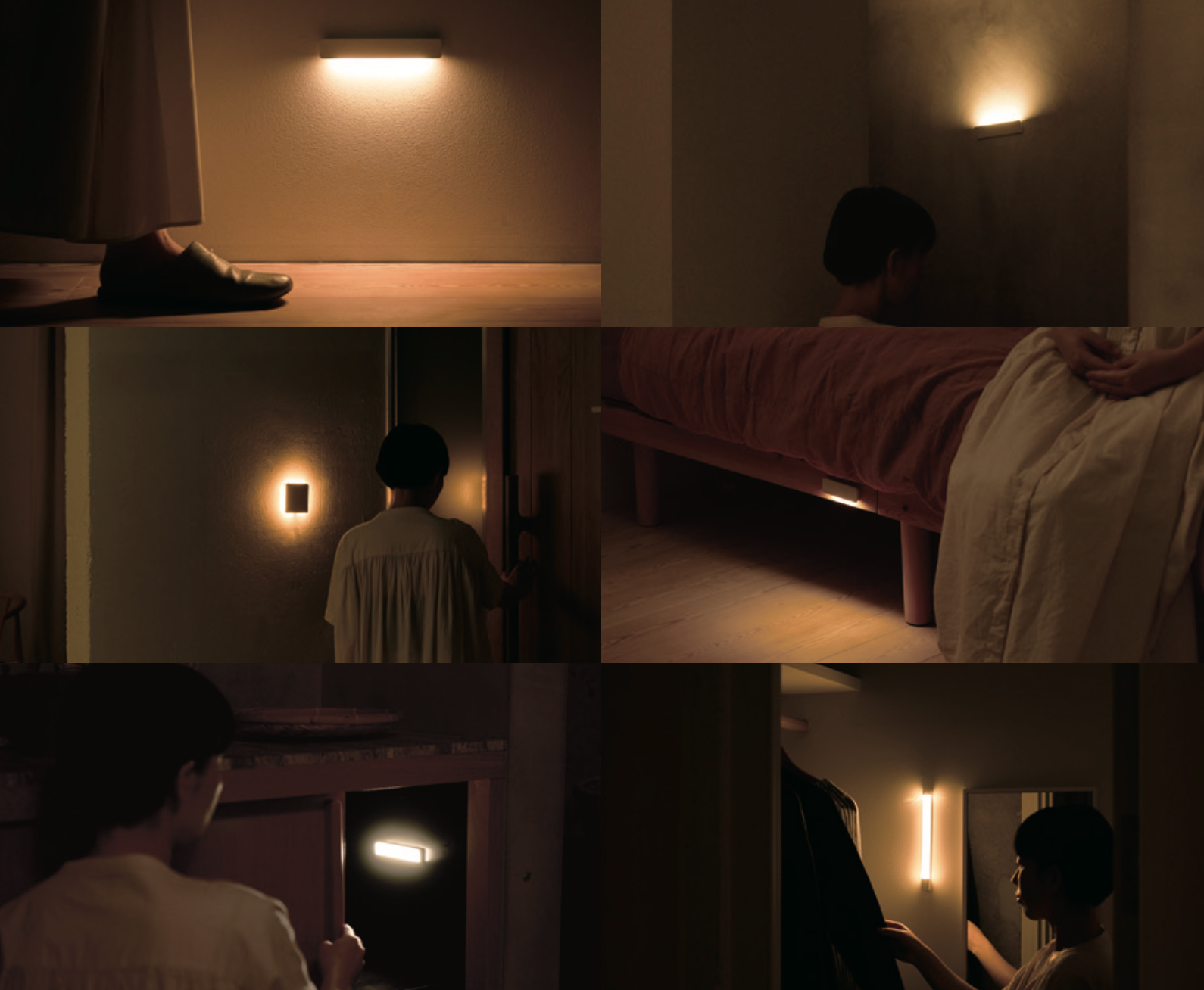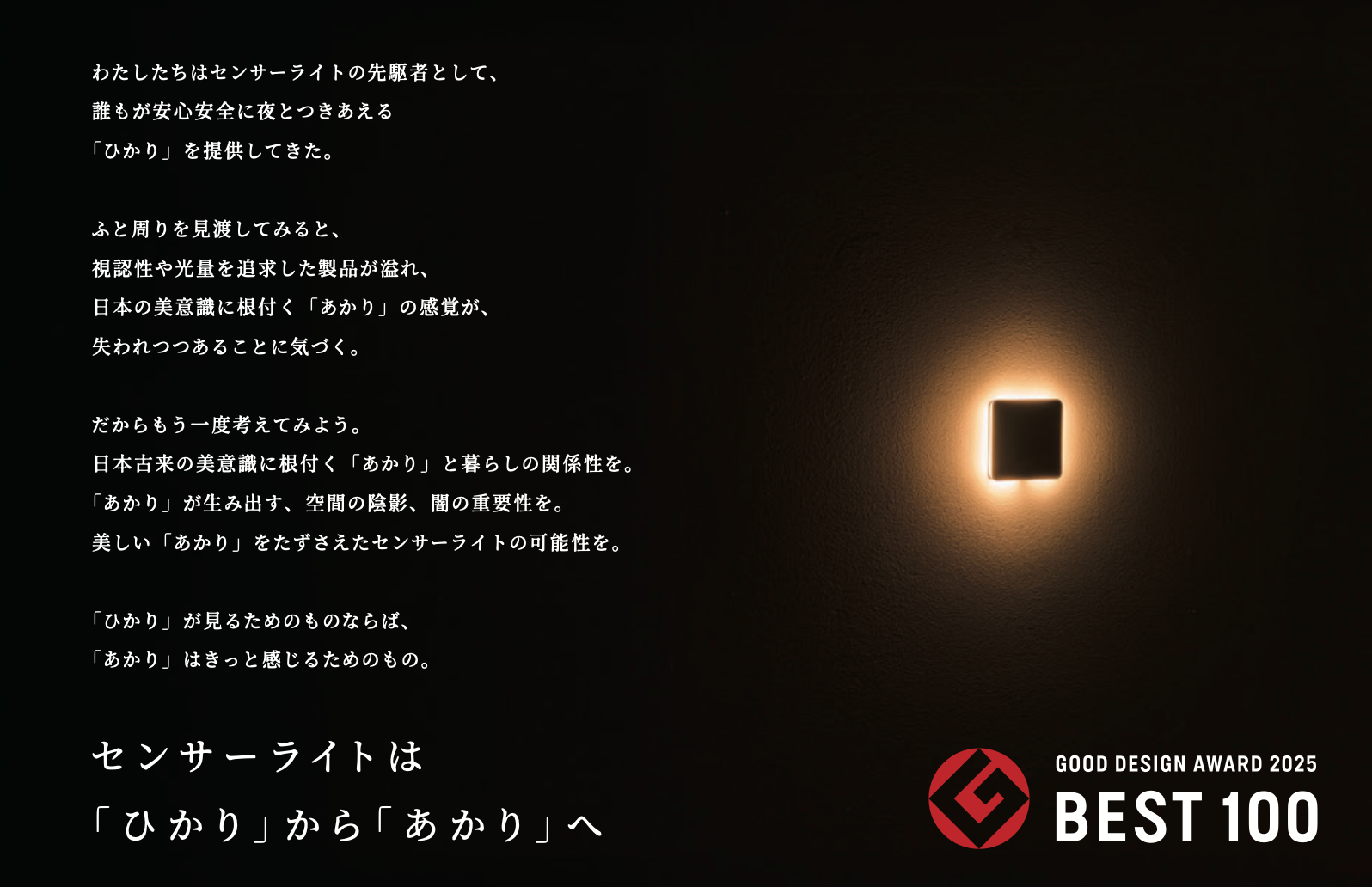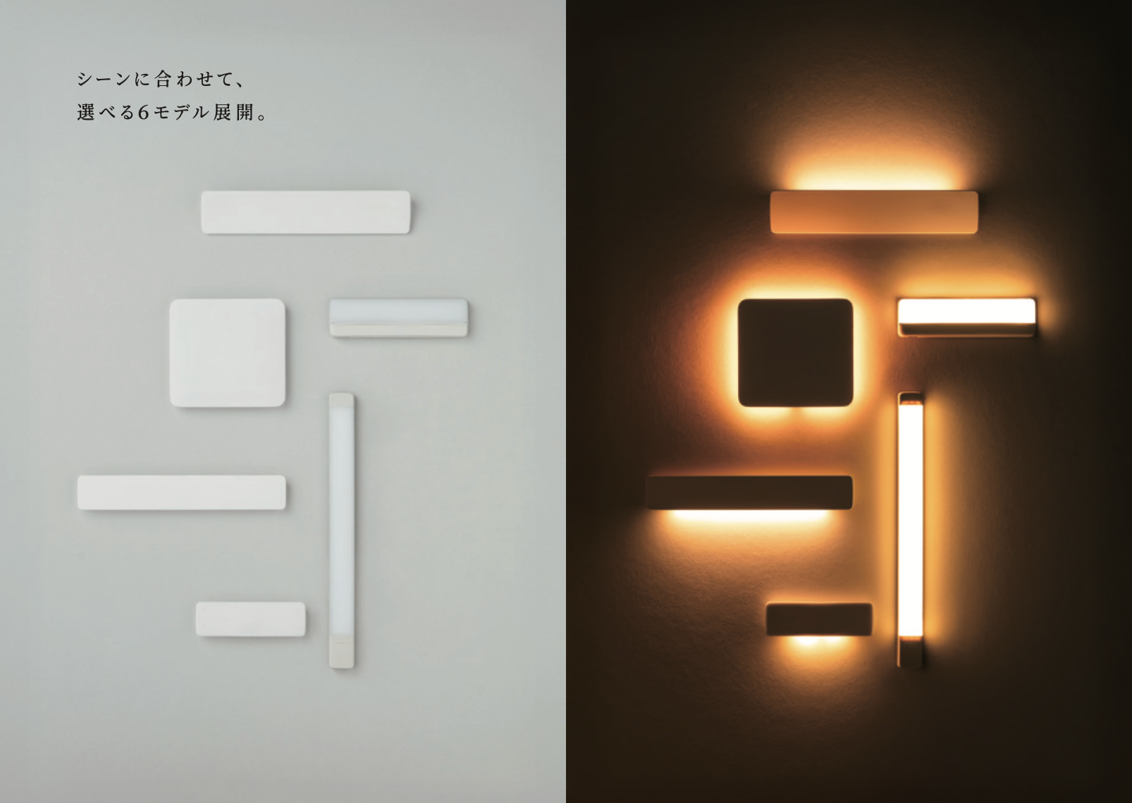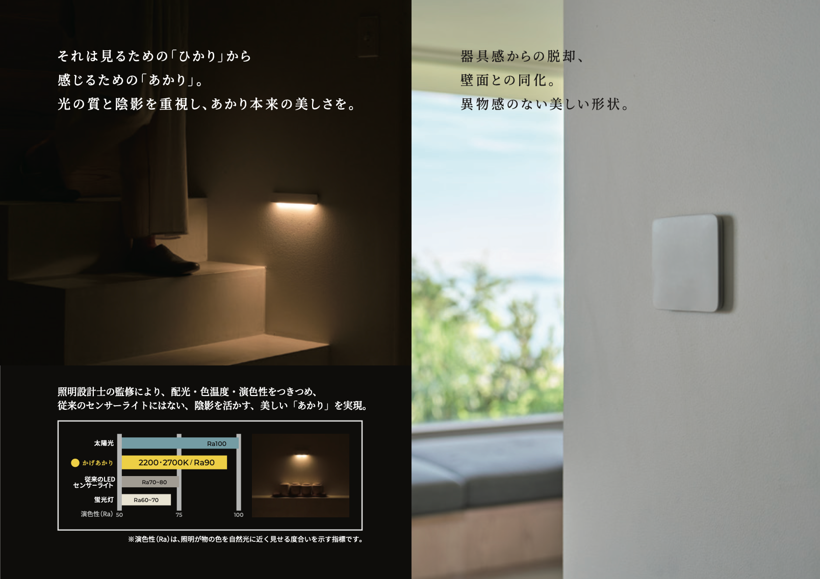 「かげあかり」は、光の質と陰影にこだわり、あかり本来の美しさを追求した屋内用センサーライトで す。点灯していない時も空間に溶け込み、どんなインテリアにも調和する造形が高く評価されました。廉 価帯の照明器具において、器具そのものではなく“光”をデザインの主題とした点が、「かげあかり」と従 来品・競合品との最大の違いです。光と陰影を引き立てるため、存在感を極力抑え、壁面と一体化するよ う設計。センサー部分は前面から見えない位置に配置するか、ボディと同色化・フラット化を徹底するこ とで、形の主張を限りなくゼロに近づけました。