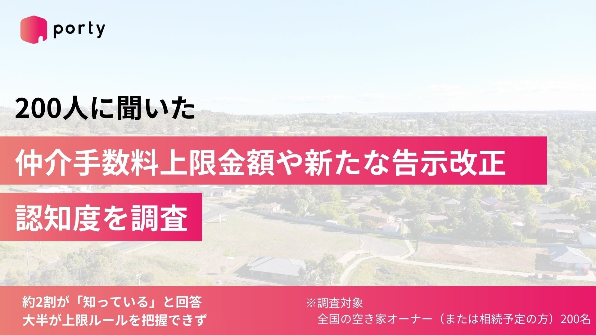株式会社ポルティ(神奈川県川崎市、代表取締役:平 瑶平、以下「ポルティ」)は、全国の空き家オーナー200名を対象に、不動産売買の仲介手数料について「上限金額」や「新たな告示改正(2024年7月施行)」をどの程度認識しているかを調査しました。