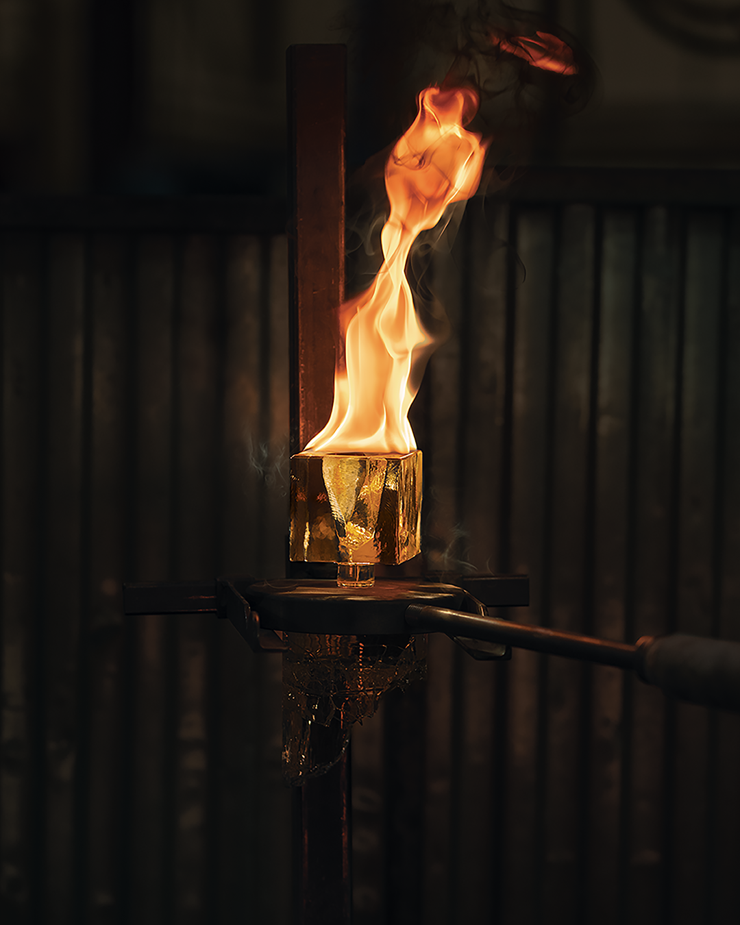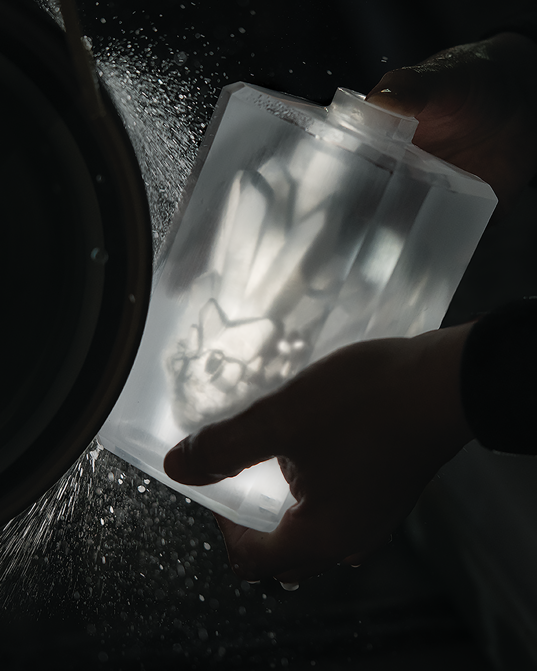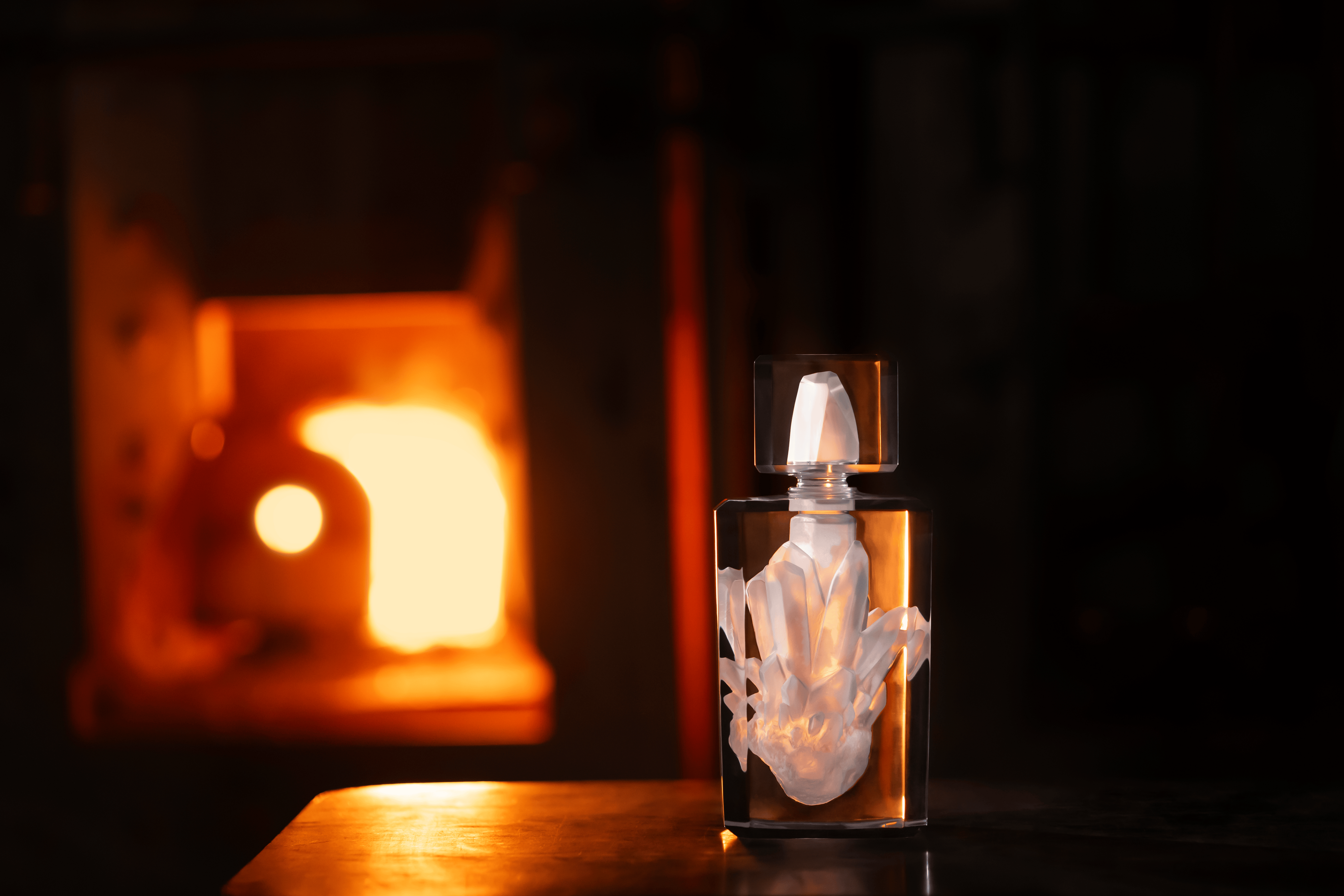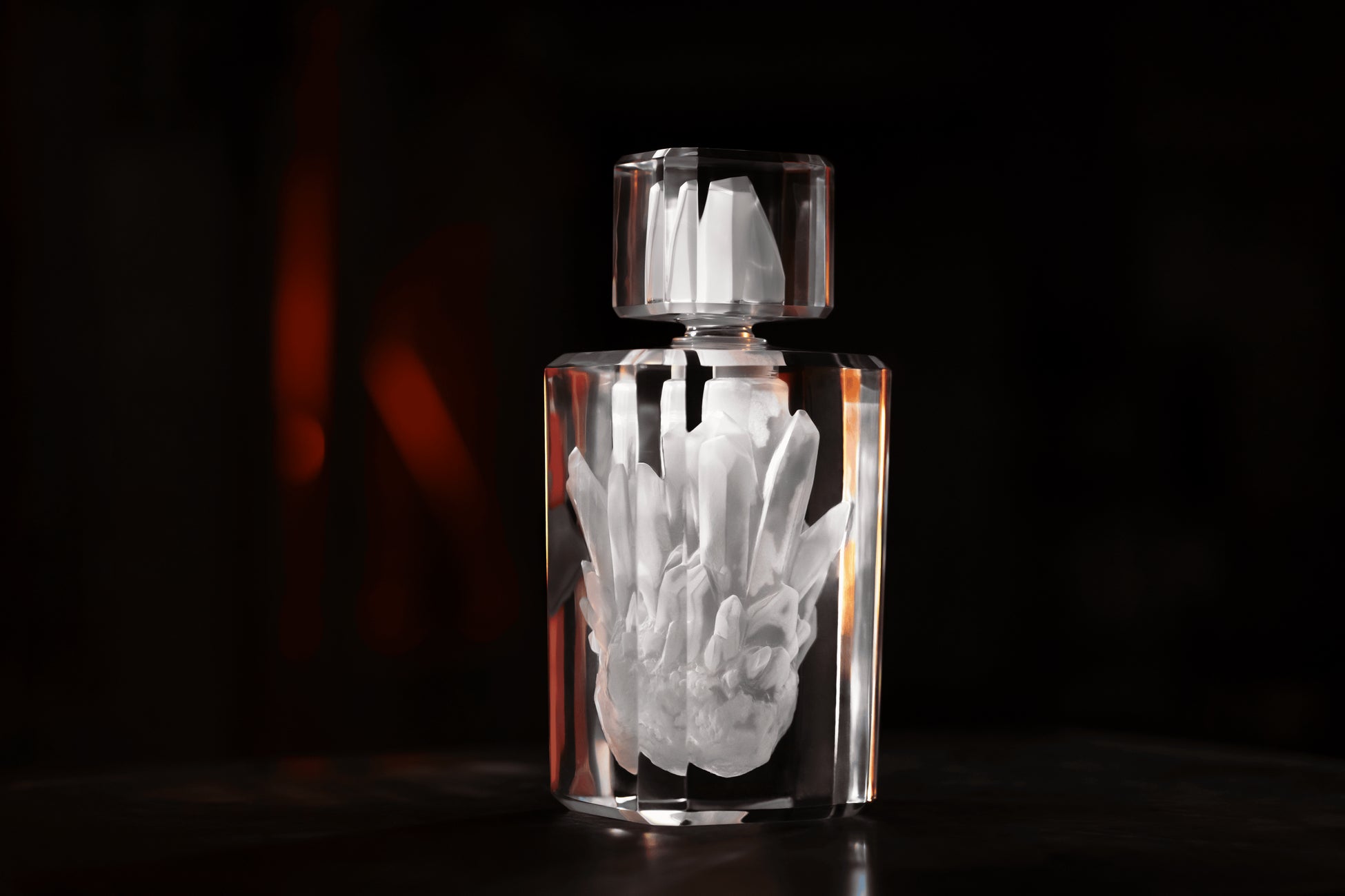 炎の中で造形されたクリスタルは、八角形のプリズムに形作られ、ブリオーニの80年の歴史を讃えるフラコンが誕生します。シャープで洗練されたラインが、クラシックなフォルムとモダンな感覚を融合させ、内部には時が凍りついたかのようにクリスタルの破片が広がっています。この精緻な内部構造は、氷河の結晶のように光を屈折させ、銀色のパルファムエッセンスとともに、魅力的な輝きを放ちます。
