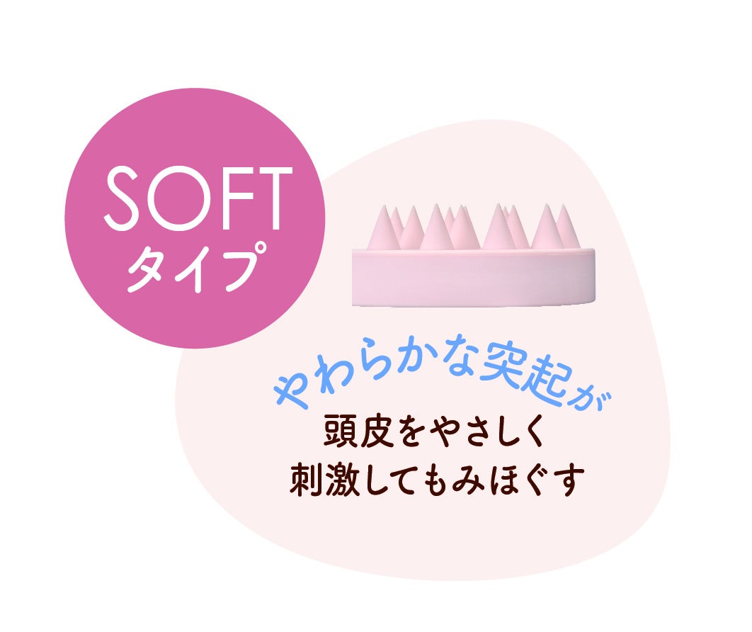 シリコーンの硬度を、既存のノーマルタイプよりもやわらかく仕上げ、頭皮をよりやさしく刺激できるよう調整しました。じっくりもみほぐしたい時に、おすすめです。