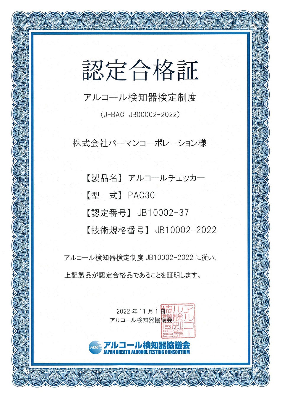 株式会社パーマンコーポレーションが提供するアルコールチェッカー直吹き式(型式:PAC30)がアルコール検知器協議会(J-BAC)の検定制度の認定機器として、1年に1回実施される維持審査に合格しました。
