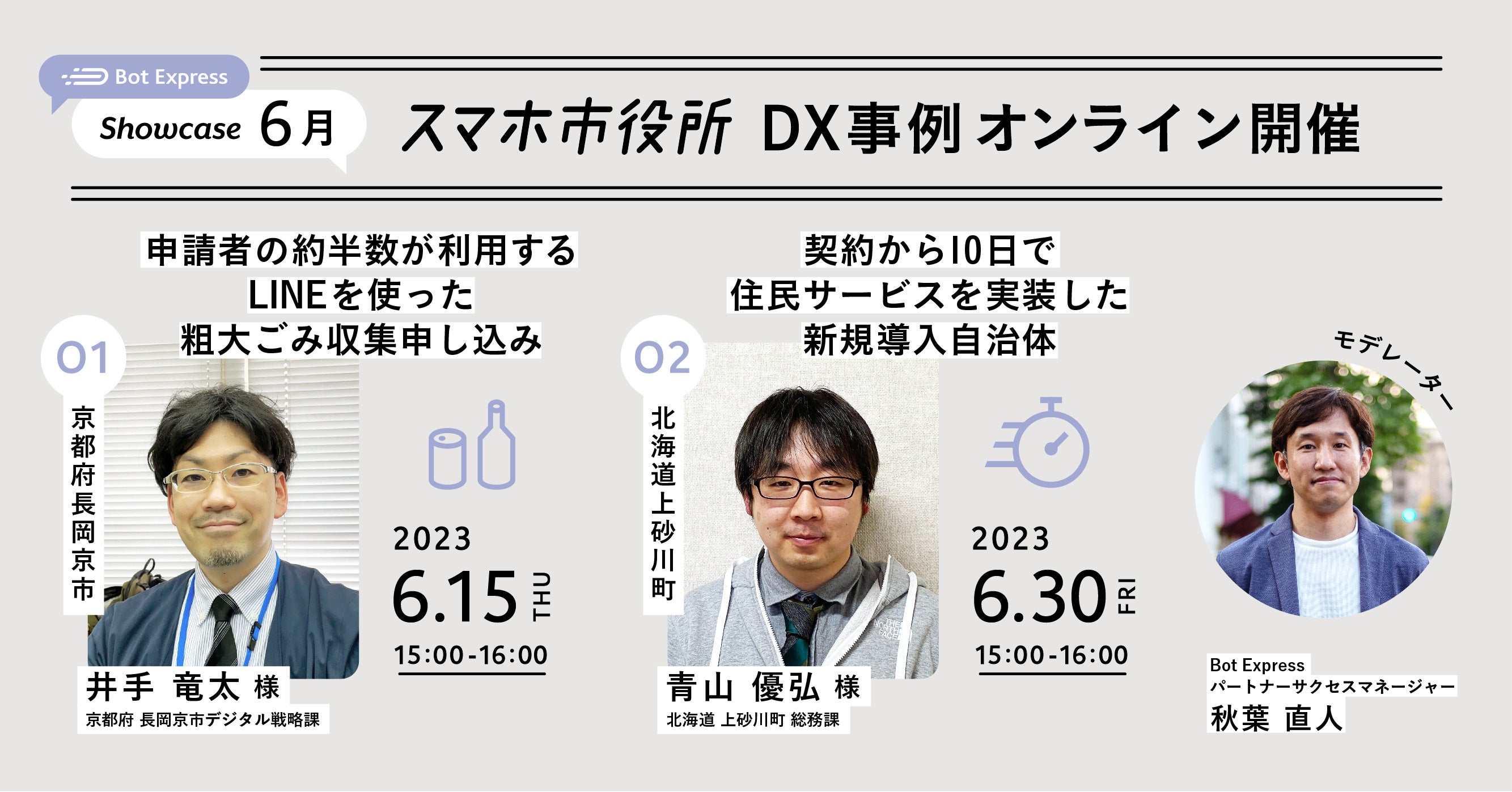 Bot Express Showcase 6月開催決定。LINEを使った粗大ごみ収集申し込み(長岡京市)、契約から10日でサービス実装した新規導入自治体(北海道上砂川町)事例