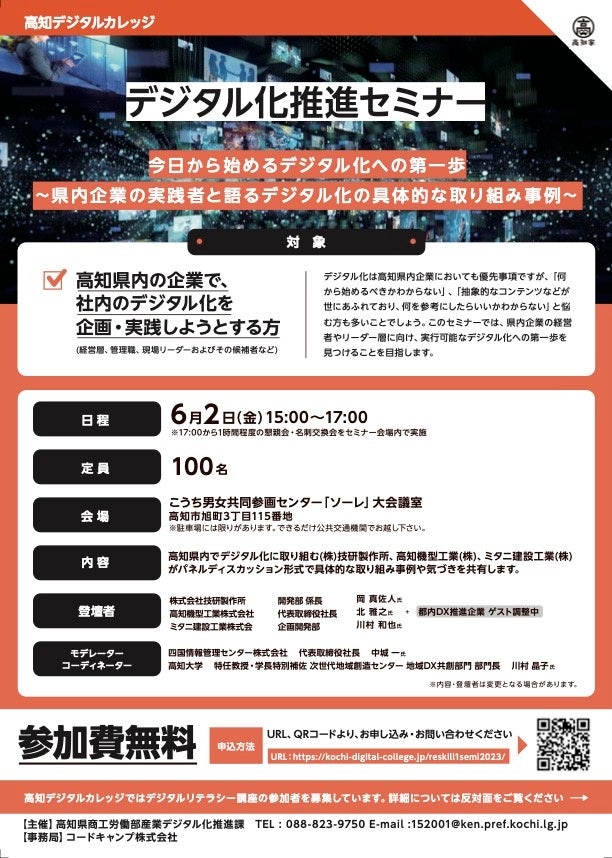 デジタルリテラシー講座と並行して、高知県内企業がデジタル化に取り組む際の参考となる情報の提供や、取組への意欲喚起を行う単発のセミナー(以下「デジタル化推進セミナー」)を開催します。デジタル化で成果をあげている先行事例の紹介、並びにデジタル化の先行事例の現地視察ツアーなどを予定しています。