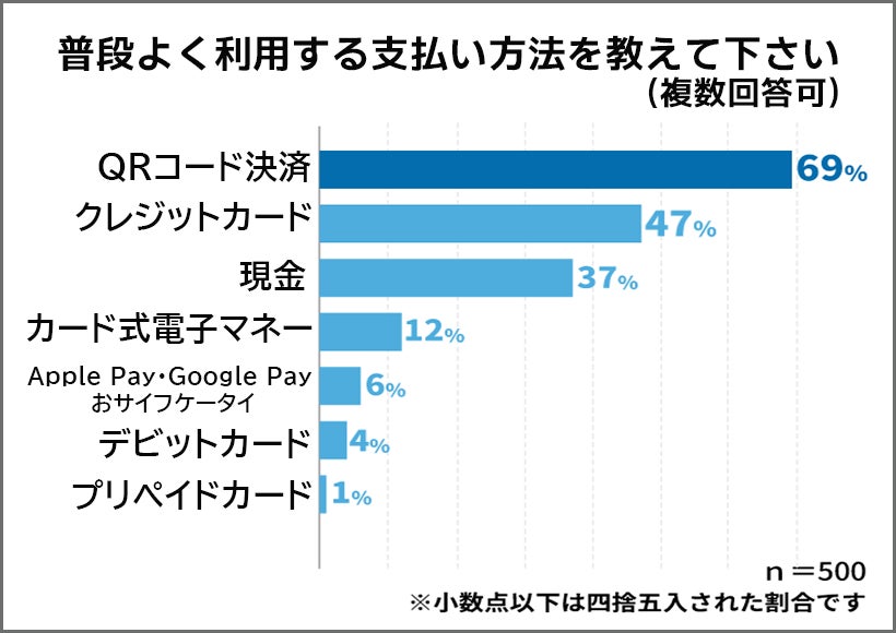 QRコード決済を利用したことがある方500名を対象に、普段よく利用する支払い方法を聞いたところ、大半の場面でキャッシュレス決済を使用する方が多くいらっしゃいました。