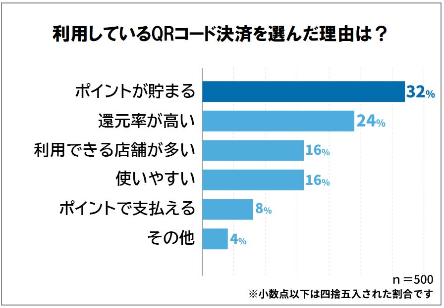 現在利用しているQRコード決済を選んだポイントとして最も回答が多かったのは「ポイントが貯まる」、続いて「還元率が高い」の回答でした。ポイント還元や割引特典はやはりキャッシュレス決済サービスの最大の魅力と言えるでしょう。
