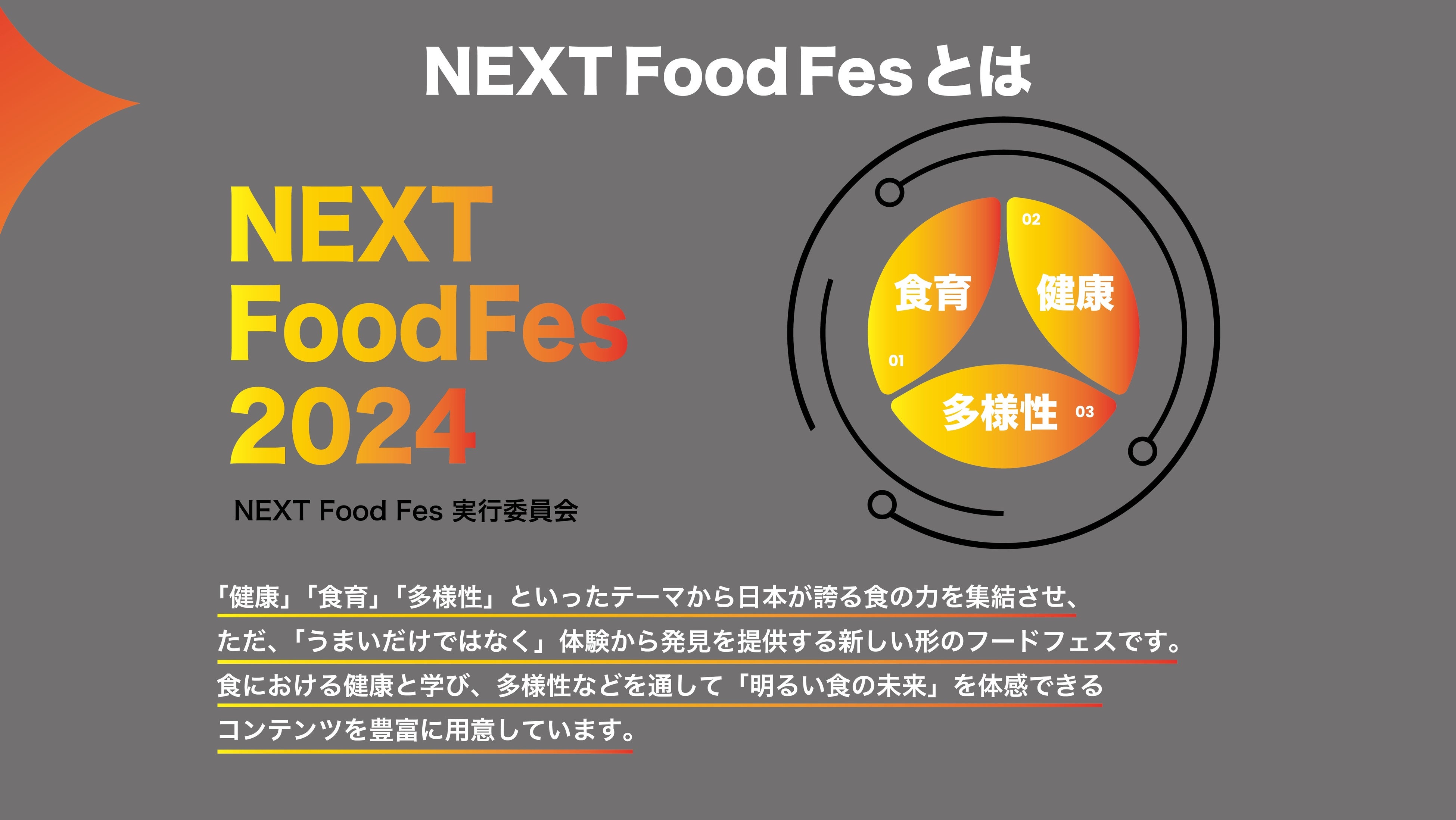 今回のフードフェスを通して、日本が誇る食の力と3つのテーマを掛け合わせてアップデートし、食をプロデュースしていくために、食の”未来”を”共創”していく「NEXT Food Fes 2024」におけるスポンサーの募集をします。