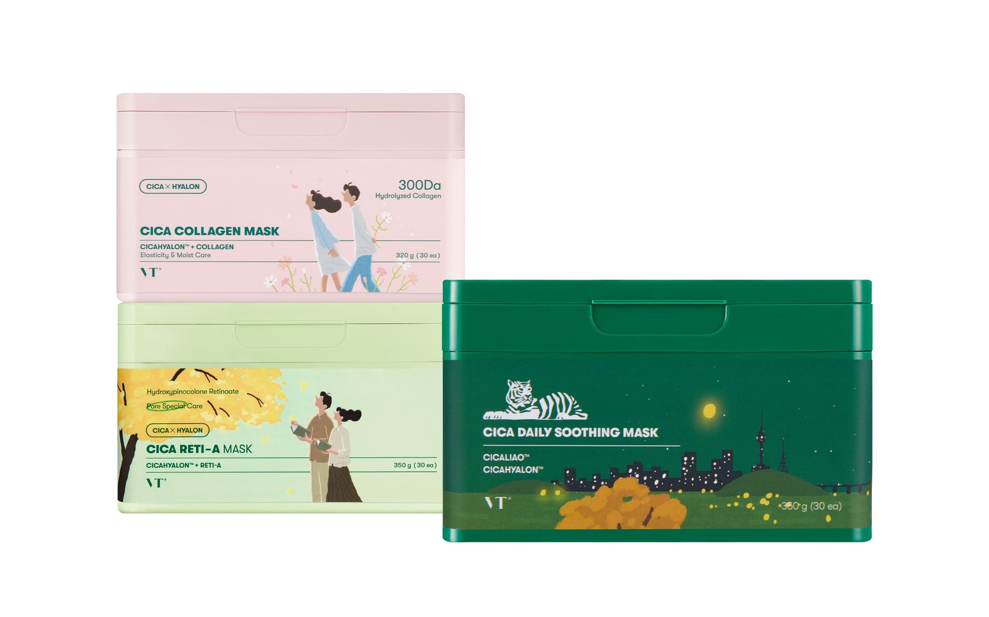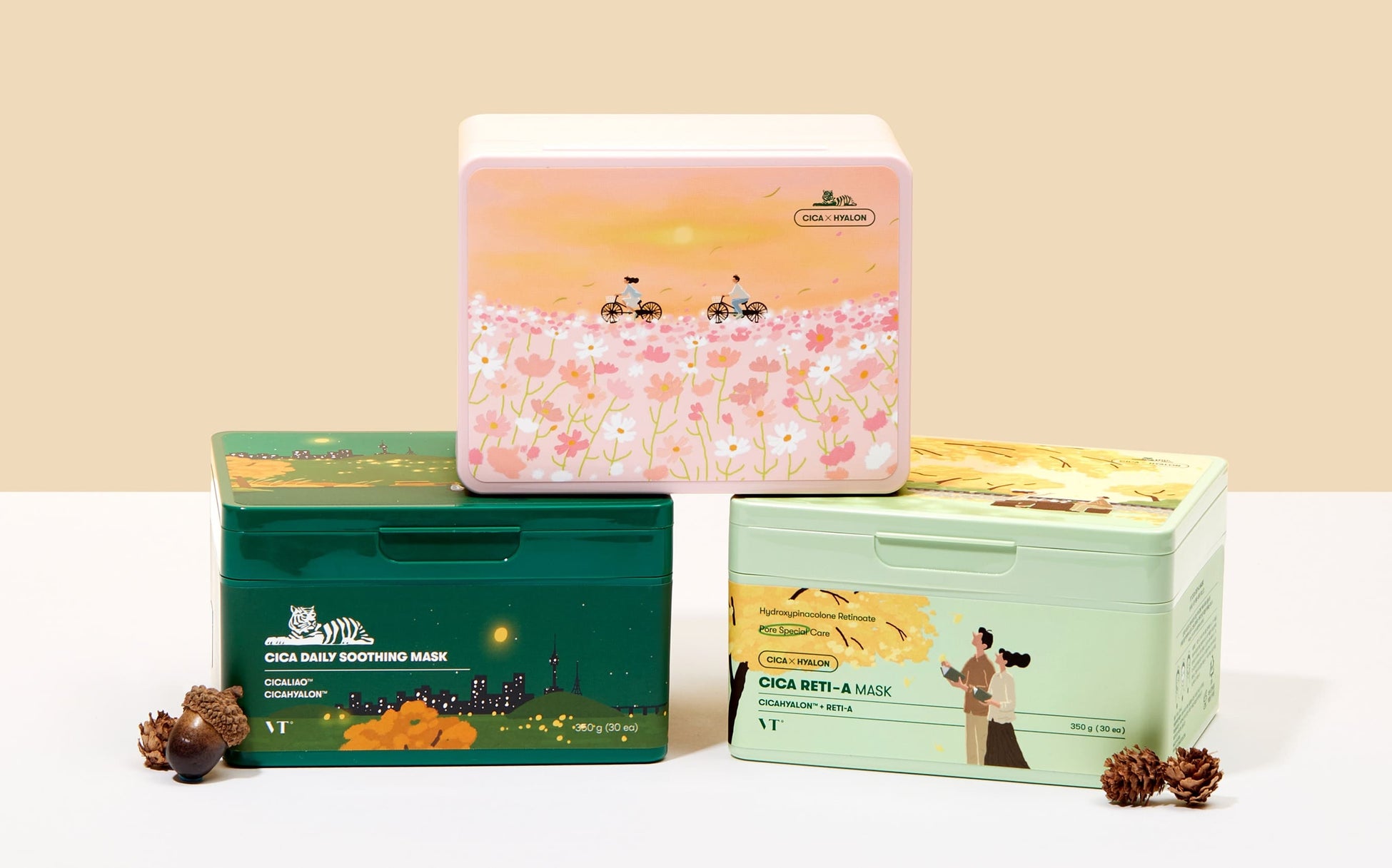 季節の変わり目でカサつきやすい肌へCICAとコラーゲン*¹で弾力&保湿ケアをご提案します。「ハローオータムセット」では、VT CICAに300Da低分子フィッシュコラーゲン*¹と大豆プラセンタ*²を加え、ふっくら弾むハリ弾力のある素肌へ導くシカコラーゲンラインからシートマスク・エッセンス・クリームがセットに!「CICA スキン」で肌のキメを整えた後、手軽にお家でハリ弾力ケアができるセットになっています。