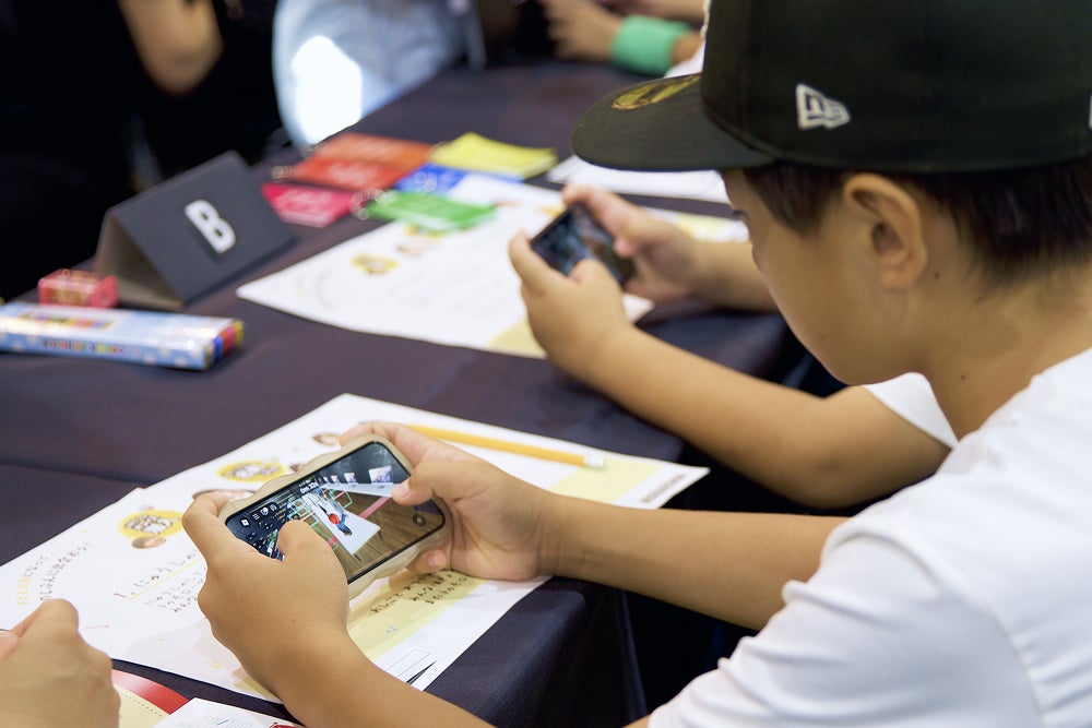 当社ブースでは、子どもたちが仮想空間のオフィスを探検し、自分の“なりたい姿”を名刺にデザインする30分間の没入型ワークショップを開催。さらに、トゥモローゲートの「キッズビジネススクール」受講生が“先生役”として運営をサポートし、自ら学んだ「仕事の楽しさ」を小さな子どもたちへ伝えました。