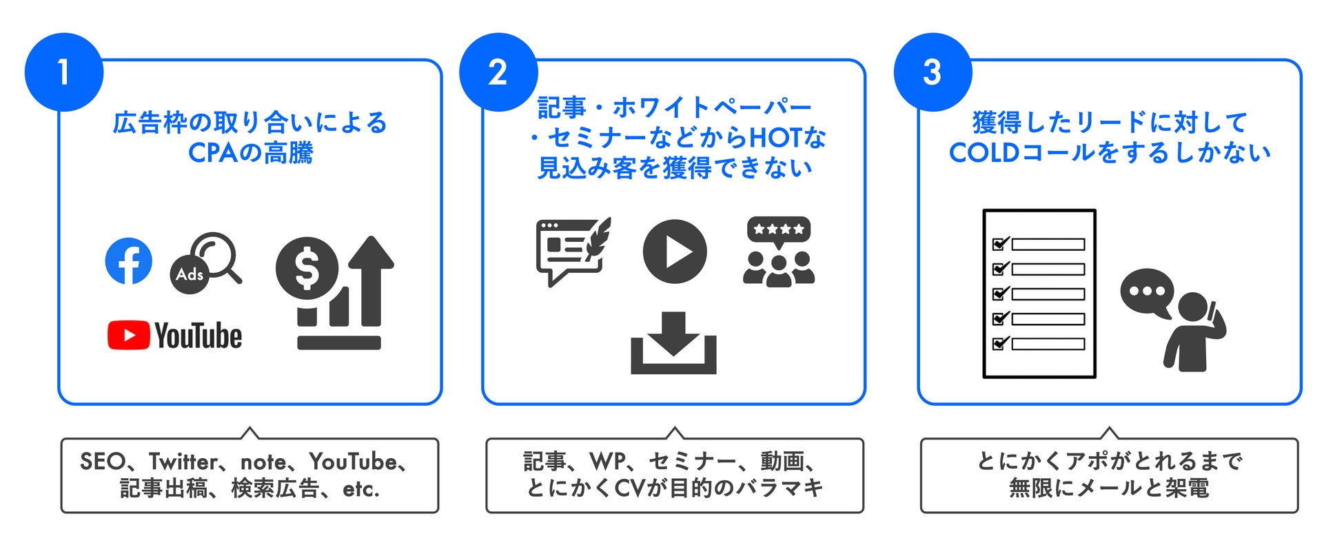 マーケティング施策において、各社がリード獲得を求めて費用を投下した結果、広告枠の取り合いによりCPAは高騰し、記事やホワイトペーパー、セミナーなどから獲得するリードも温度感は低く、アポイント・商談獲得のためには、インサイドセールスによるCOLDコールを行うしかない、といった悪循環が多くの企業で発生しています。