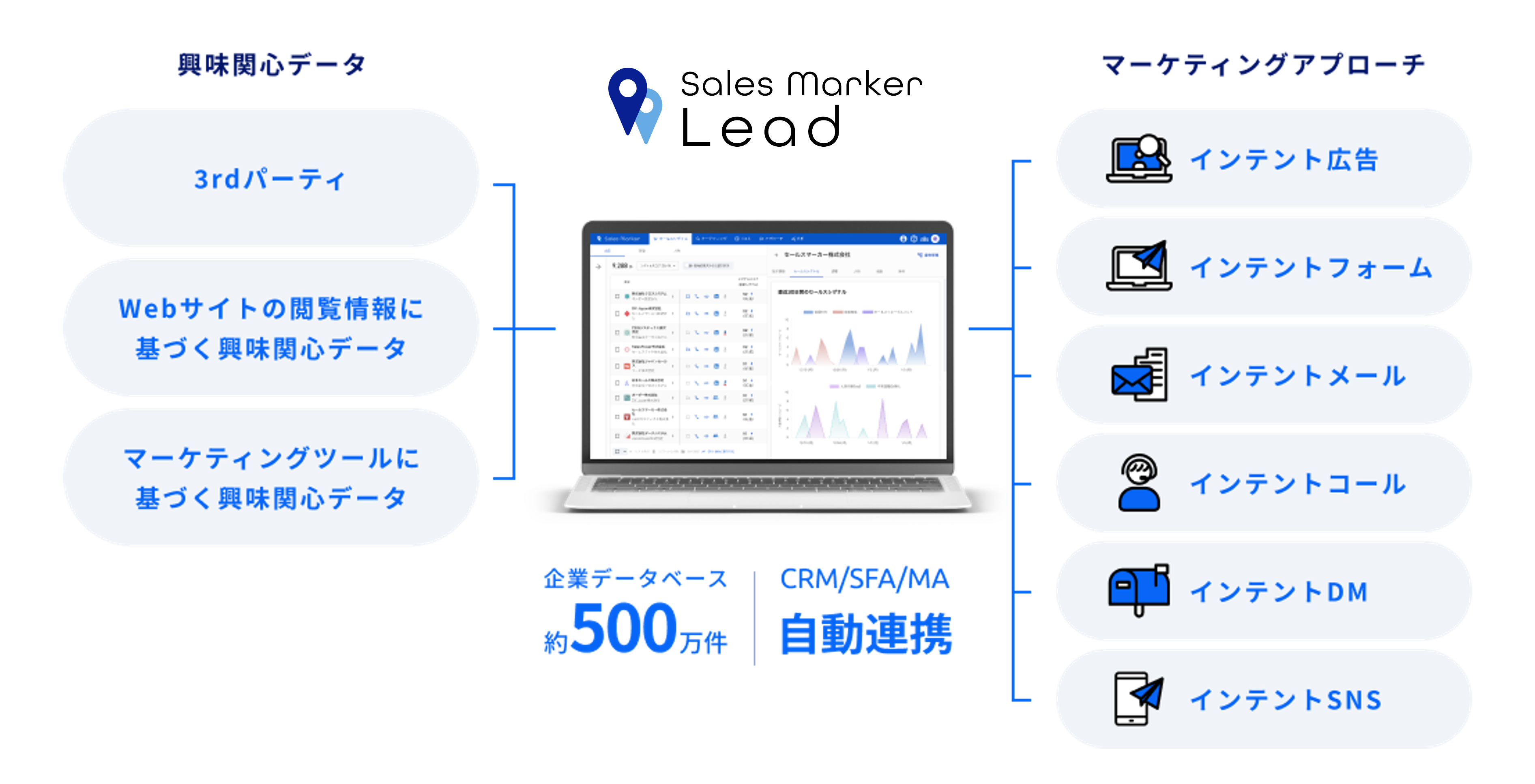 Sales Marker Leadは、約500万法人の企業データベースと「インテントデータ(興味関心データ)」を組み合わせるSales Markerの特徴をそのままに、ニーズの高まった企業をターゲティングするインテント広告やインテントナーチャリングなど、新時代のマーケティング手法を実現しています。
