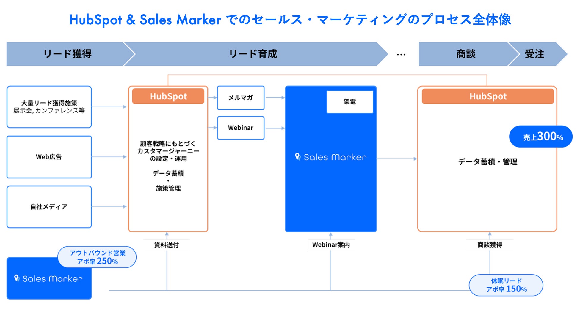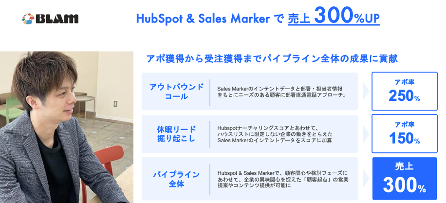 実際にインテントマーケティングを実践しているBLAM様では、Sales Markerのインテントデータと部署・担当者情報の活用によって、アウトバウンドでの商談獲得率が250%、ハウスリストの休眠リードからの商談獲得率は150%となるなど、大きな成果を創出することができています。また、HubSpotとSales Markerを組み合わせることで、パイプライン全体のマーケティング・セールスのプロセスを最適化し、売上300%を達成しています。Sales MarkerとHubSpotの組み合わせにより、MA/CRMの活用効果を最大化することができています。